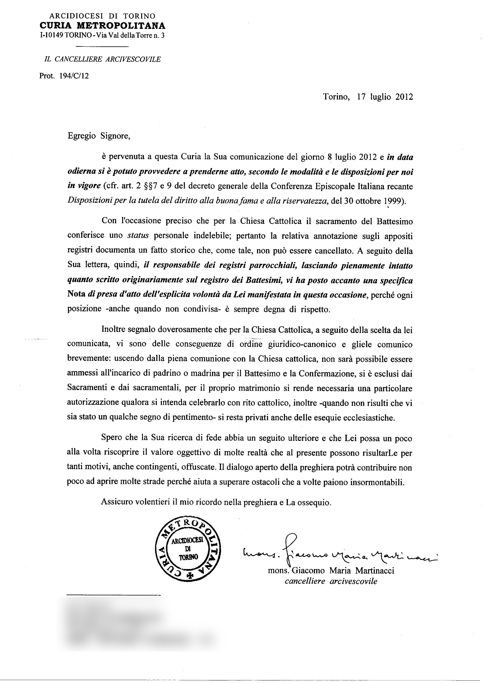 Una persona ha chiesto la rettifica dei dati relativi al proprio battesimo avvenuto a Stimmate di S. Francesco d'Assisi - TORINO (TO) il 17/07/2012, dichiarando di non voler più far parte della Chiesa Cattolica.