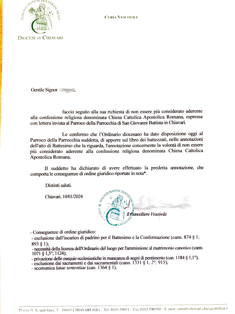 Una persona ha chiesto la rettifica dei dati relativi al proprio battesimo avvenuto a S. Giacomo di Rupinaro - CHIAVARI (GE) il 10/01/2024, dichiarando di non voler più far parte della Chiesa Cattolica.