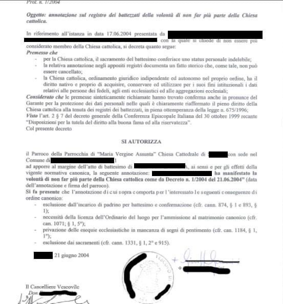 Una persona ha chiesto la rettifica dei dati relativi al proprio battesimo avvenuto a Maria Vergine Assunta - Cattedrale - SALUZZO (CN) il 21/06/2004, dichiarando di non voler più far parte della Chiesa Cattolica.