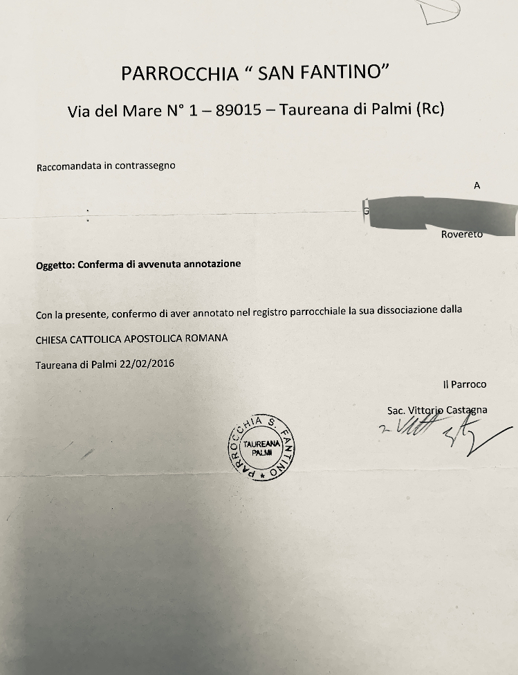 Una persona ha chiesto la rettifica dei dati relativi al proprio battesimo avvenuto a S. Fantino - PALMI (RC) il 22/02/2016, dichiarando di non voler più far parte della Chiesa Cattolica.