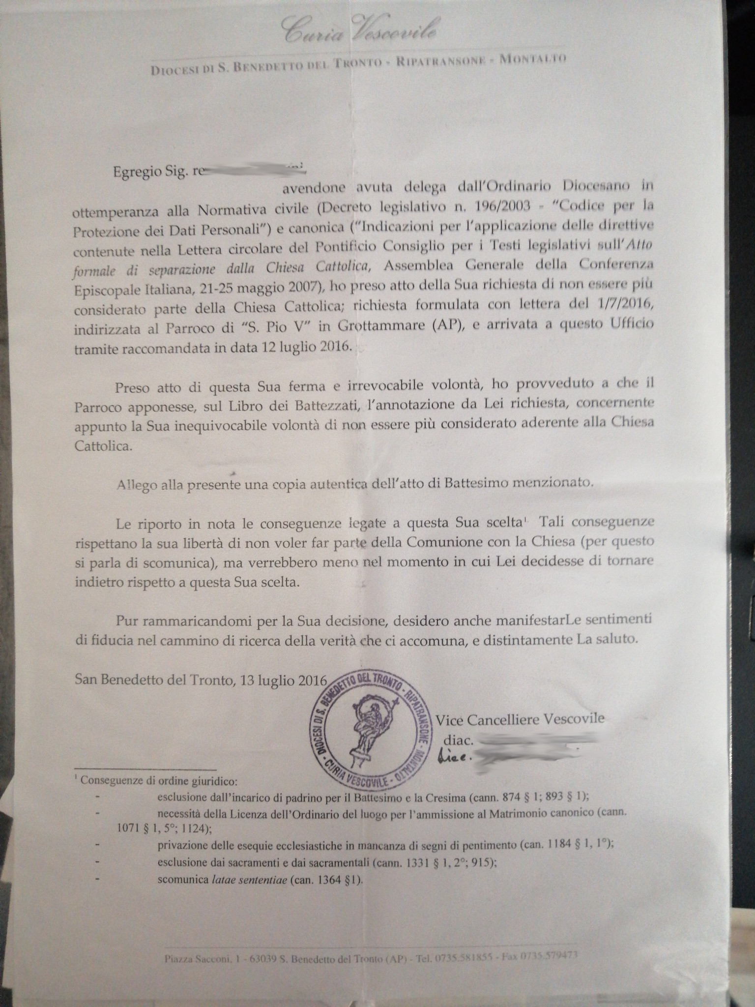 Una persona ha chiesto la rettifica dei dati relativi al proprio battesimo avvenuto a S. Pio Quinto - GROTTAMMARE (AP) il 04/03/2017, dichiarando di non voler più far parte della Chiesa Cattolica.