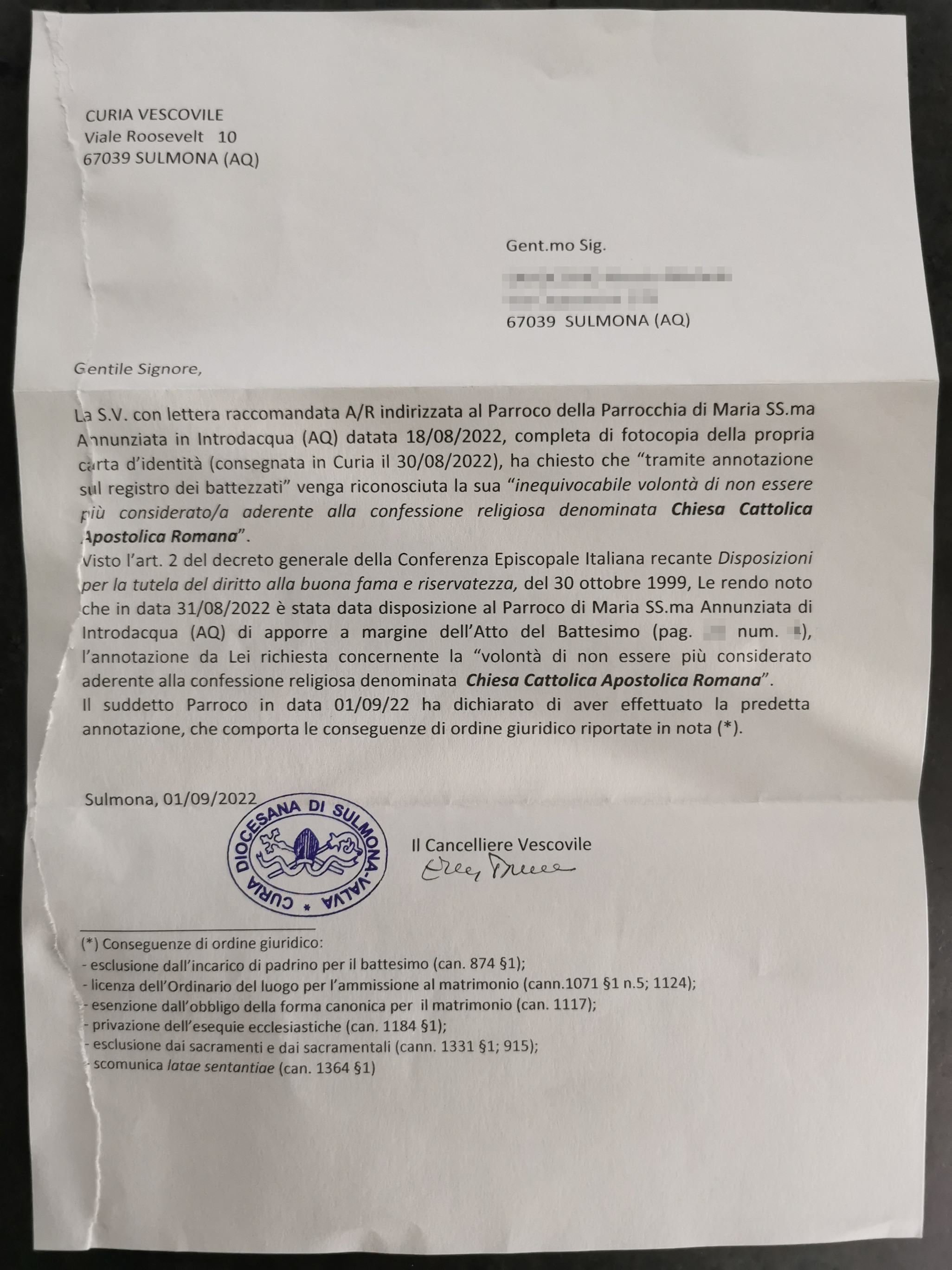 Una persona ha chiesto la rettifica dei dati relativi al proprio battesimo avvenuto a Maria Ss. Annunziata - INTRODACQUA (AQ) il 05/09/2022, dichiarando di non voler più far parte della Chiesa Cattolica.