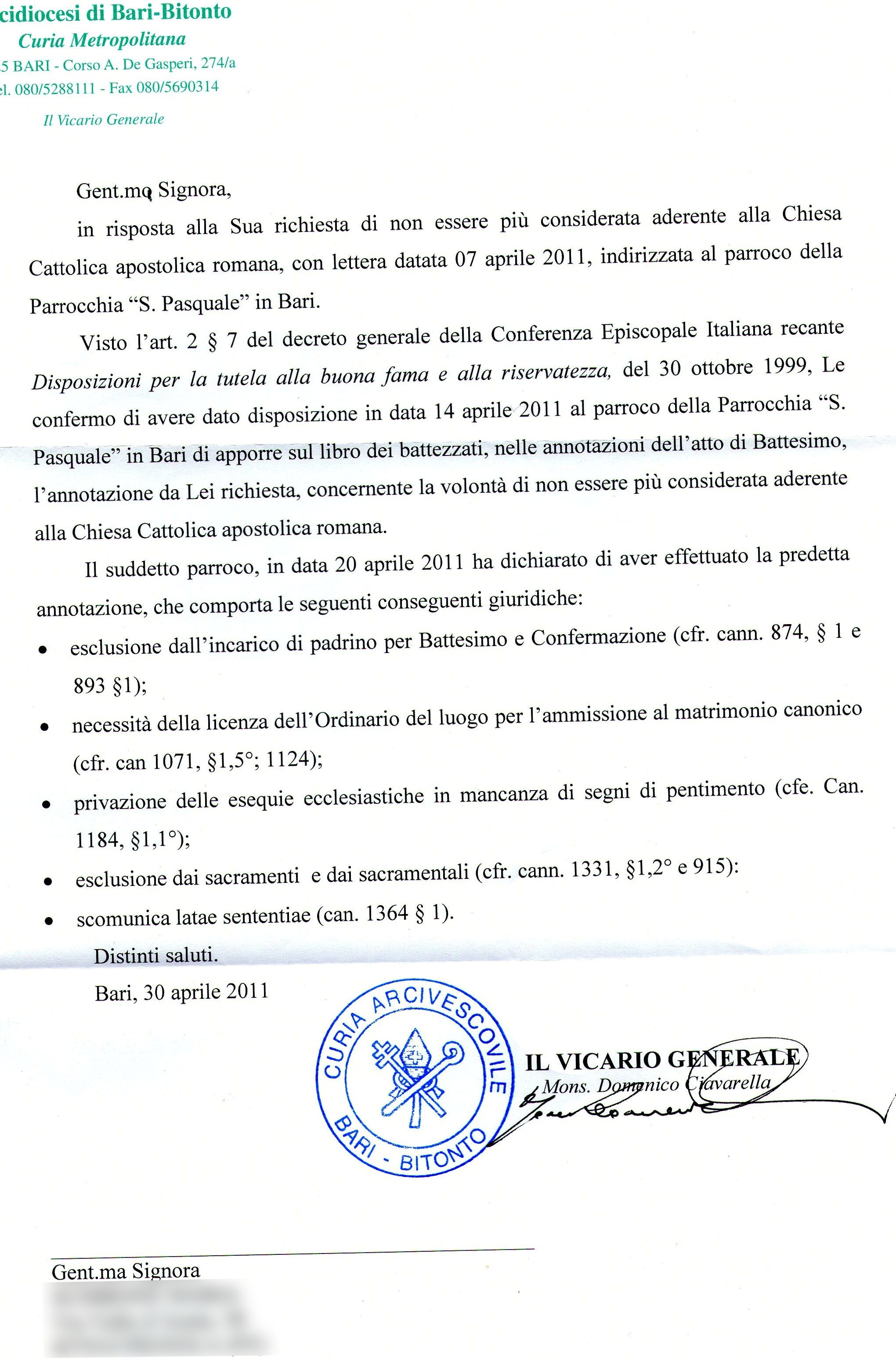 Una persona ha chiesto la rettifica dei dati relativi al proprio battesimo avvenuto a S. Pasquale - BARI (BA) il 30/04/2011, dichiarando di non voler più far parte della Chiesa Cattolica.