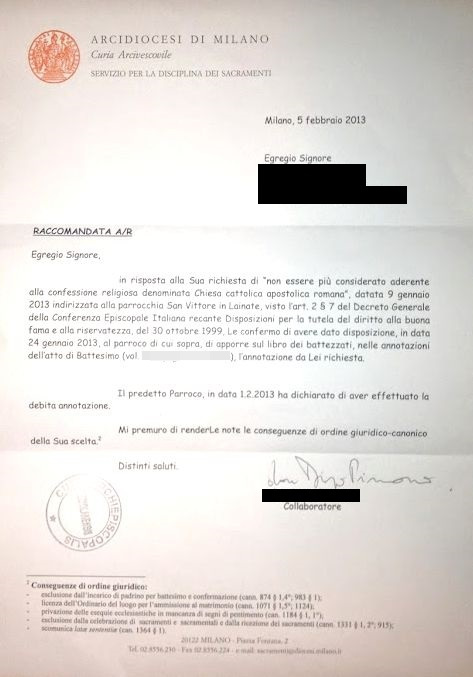Una persona ha chiesto la rettifica dei dati relativi al proprio battesimo avvenuto a S. Vittore M. - LAINATE (MI) il 05/02/2013, dichiarando di non voler più far parte della Chiesa Cattolica.