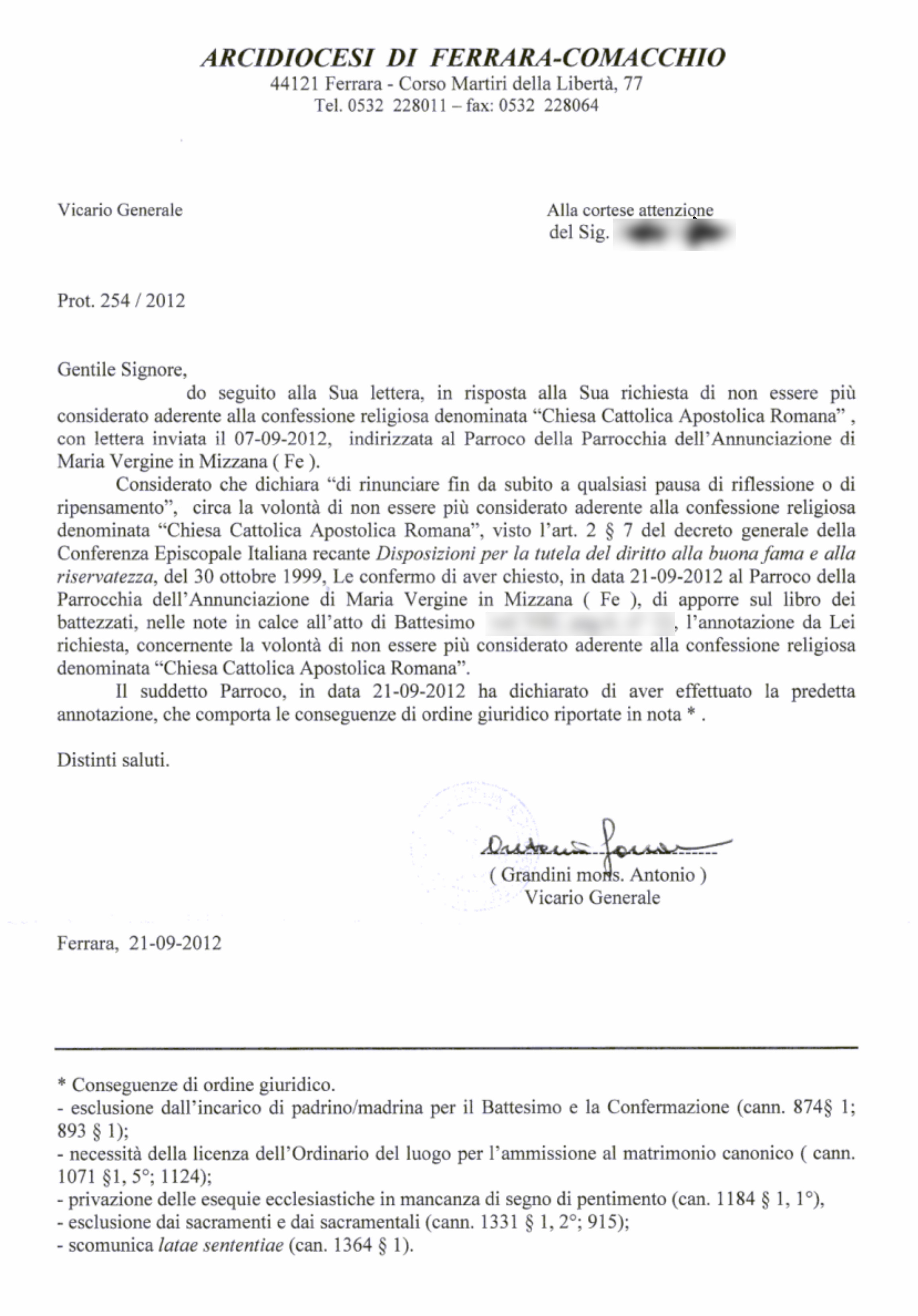Una persona ha chiesto la rettifica dei dati relativi al proprio battesimo avvenuto a Annunciazione di Maria Vergine - MIZZANA (FE) il 21/09/2012, dichiarando di non voler più far parte della Chiesa Cattolica.