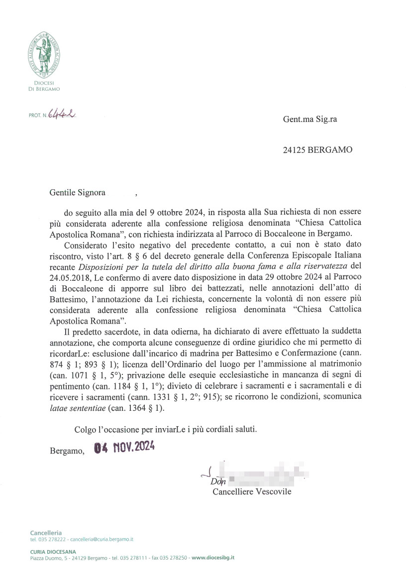 Una persona ha chiesto la rettifica dei dati relativi al proprio battesimo avvenuto a Santi Pietro e Paolo Apostoli - BERGAMO (BG) il 04/11/2024, dichiarando di non voler più far parte della Chiesa Cattolica.