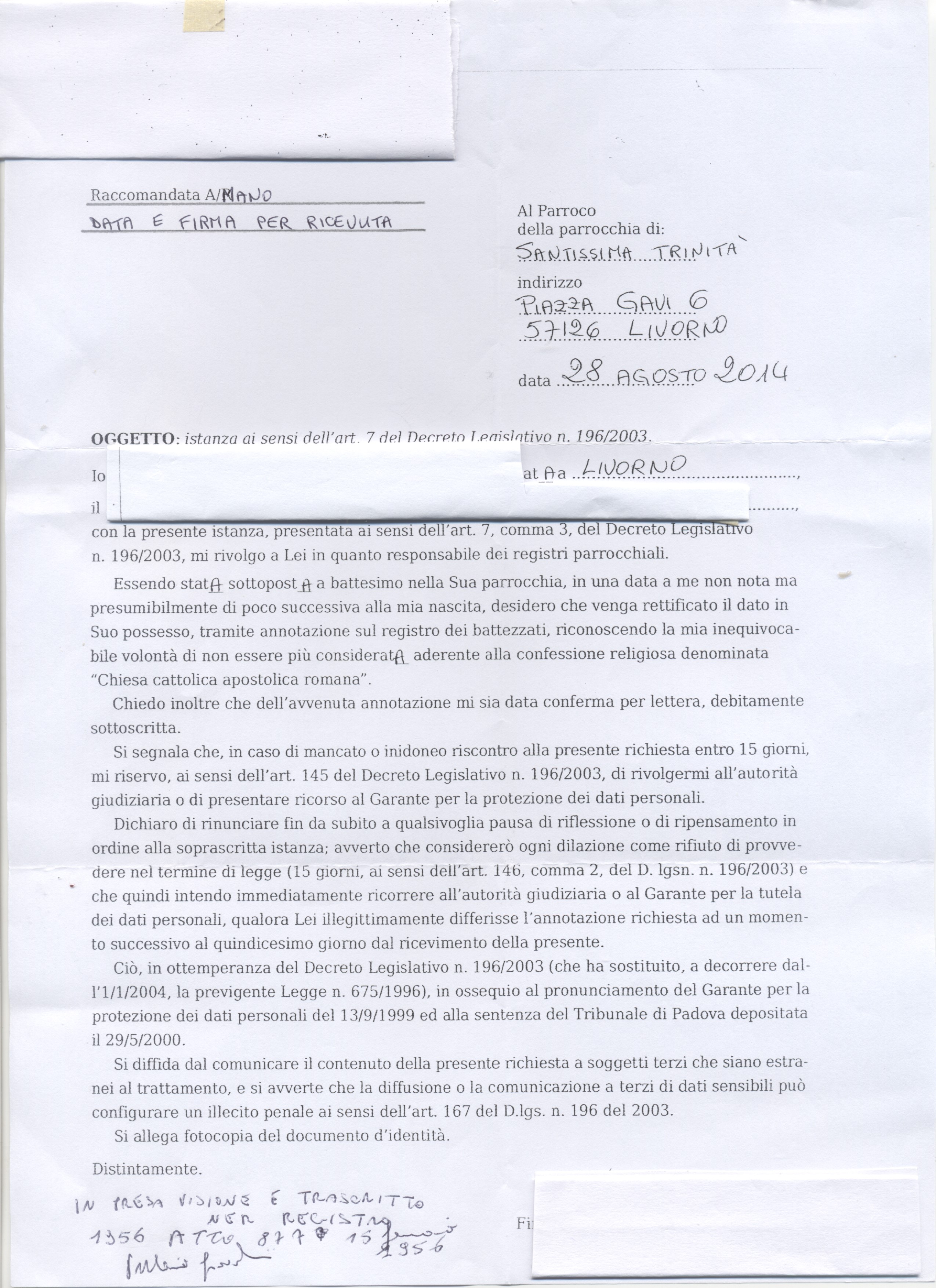 Una persona ha chiesto la rettifica dei dati relativi al proprio battesimo avvenuto a Ss. Trinità - LIVORNO (LI) il 28/08/2014, dichiarando di non voler più far parte della Chiesa Cattolica.