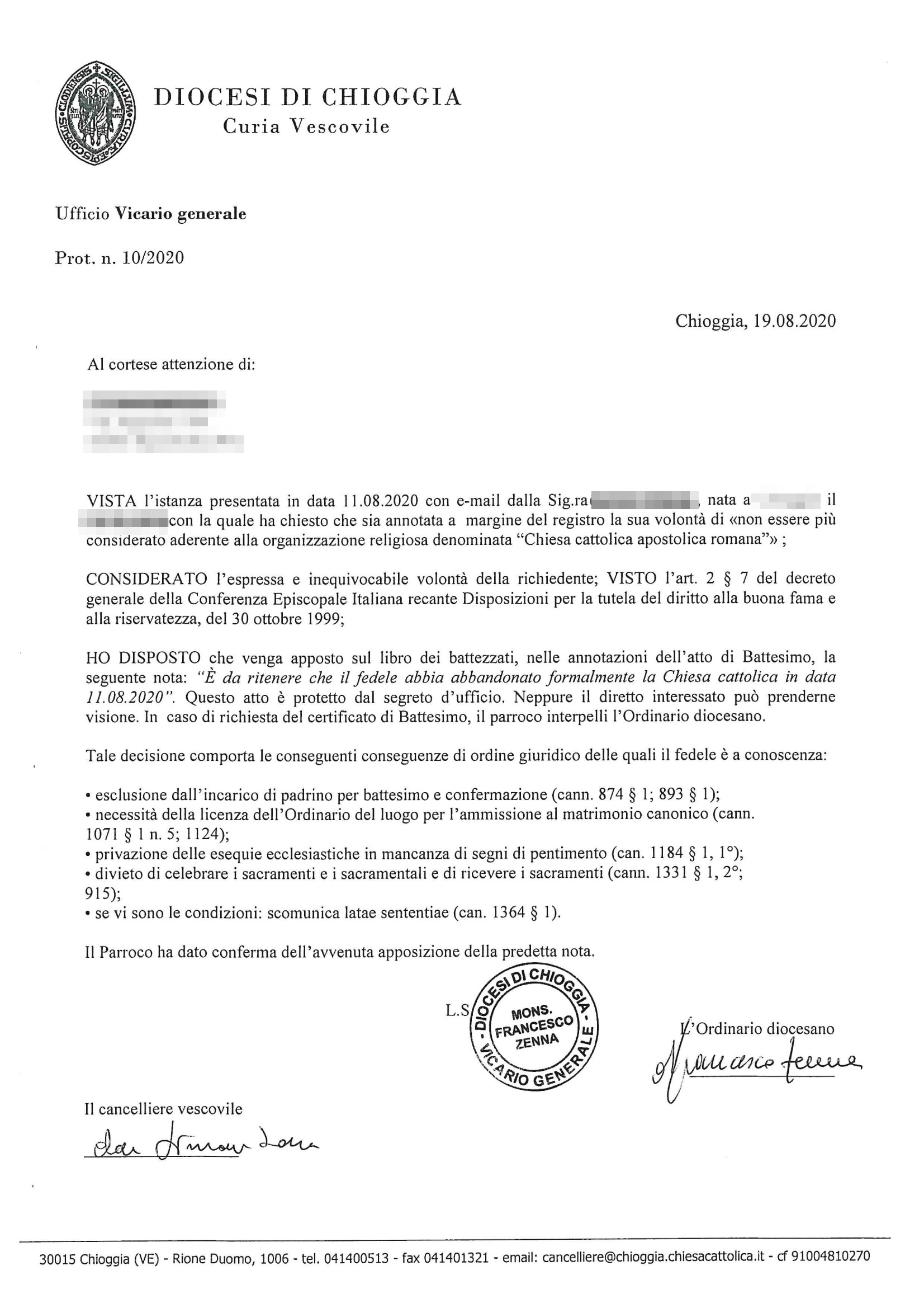 Una persona ha chiesto la rettifica dei dati relativi al proprio battesimo avvenuto a San Giovanni Battista - CHIOGGIA (VE) il 19/08/2020, dichiarando di non voler più far parte della Chiesa Cattolica.