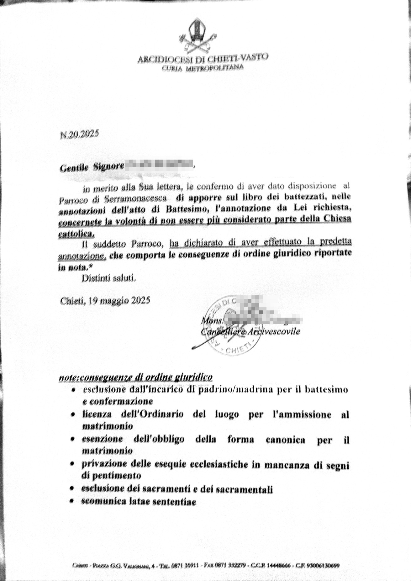Una persona ha chiesto la rettifica dei dati relativi al proprio battesimo avvenuto a Santa Maria Assunta - SERRAMONACESCA (PE) il 27/05/2025, dichiarando di non voler più far parte della Chiesa Cattolica.
