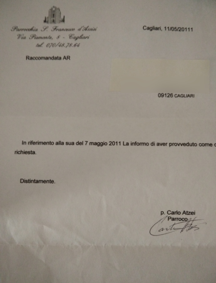 Una persona ha chiesto la rettifica dei dati relativi al proprio battesimo avvenuto a S. Francesco d'Assisi - CAGLIARI (CA) il 11/05/2011, dichiarando di non voler più far parte della Chiesa Cattolica.