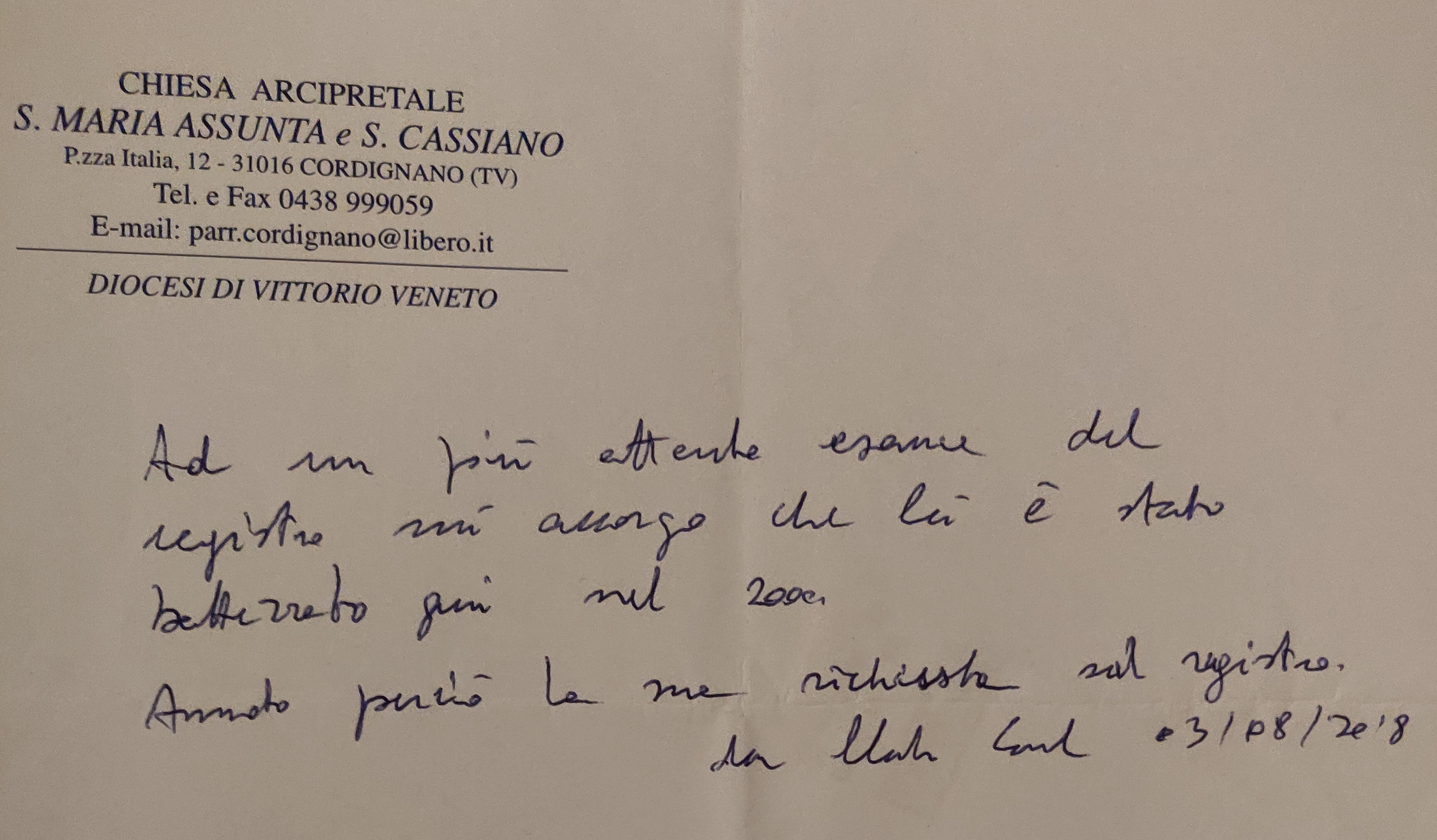 Una persona ha chiesto la rettifica dei dati relativi al proprio battesimo avvenuto a S. Maria Assunta e S. Cassiano - CORDIGNANO (TV) il 03/08/2018, dichiarando di non voler più far parte della Chiesa Cattolica.