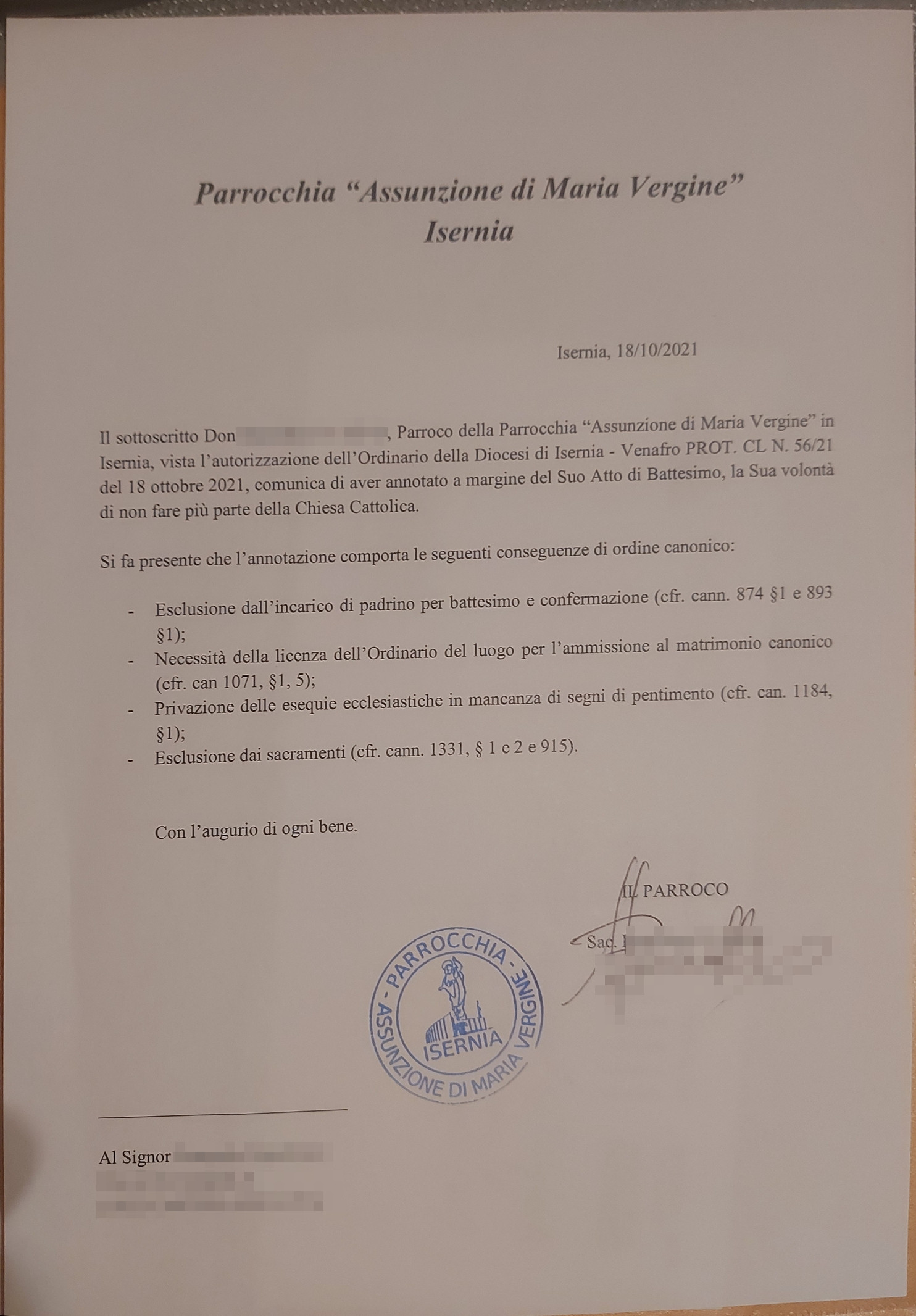 Una persona ha chiesto la rettifica dei dati relativi al proprio battesimo avvenuto a Assunzione di Maria Vergine - ISERNIA (IS) il 18/10/2021, dichiarando di non voler più far parte della Chiesa Cattolica.