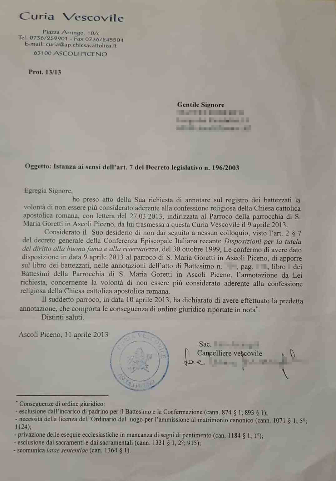 Una persona ha chiesto la rettifica dei dati relativi al proprio battesimo avvenuto a S. Maria Goretti - ASCOLI PICENO (AP) il 11/04/2013, dichiarando di non voler più far parte della Chiesa Cattolica.