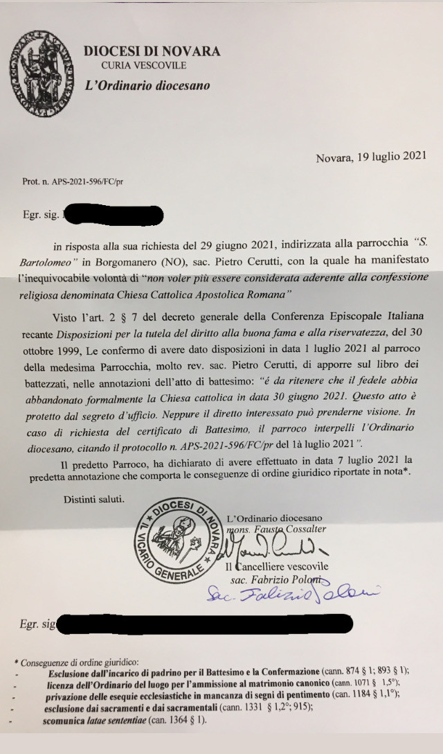 Una persona ha chiesto la rettifica dei dati relativi al proprio battesimo avvenuto a San Bartolomeo - BORGOMANERO (NO) il 07/07/2021, dichiarando di non voler più far parte della Chiesa Cattolica.