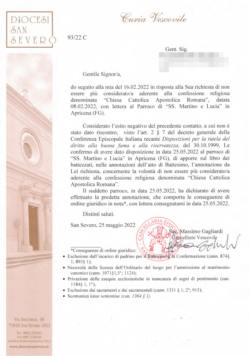 Una persona ha chiesto la rettifica dei dati relativi al proprio battesimo avvenuto a Santi Martino e Lucia - APRICENA (FG) il 25/05/2022, dichiarando di non voler più far parte della Chiesa Cattolica.