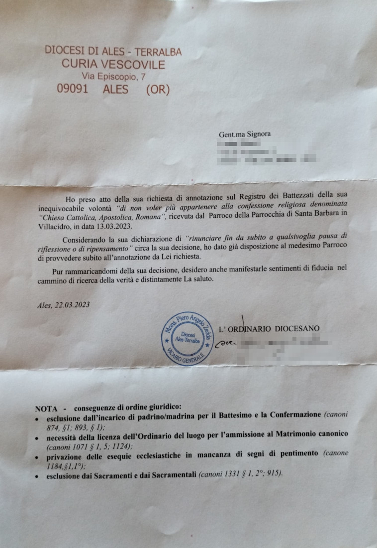 Una persona ha chiesto la rettifica dei dati relativi al proprio battesimo avvenuto a S. Barbara - VILLACIDRO (SU) il 27/04/2023, dichiarando di non voler più far parte della Chiesa Cattolica.