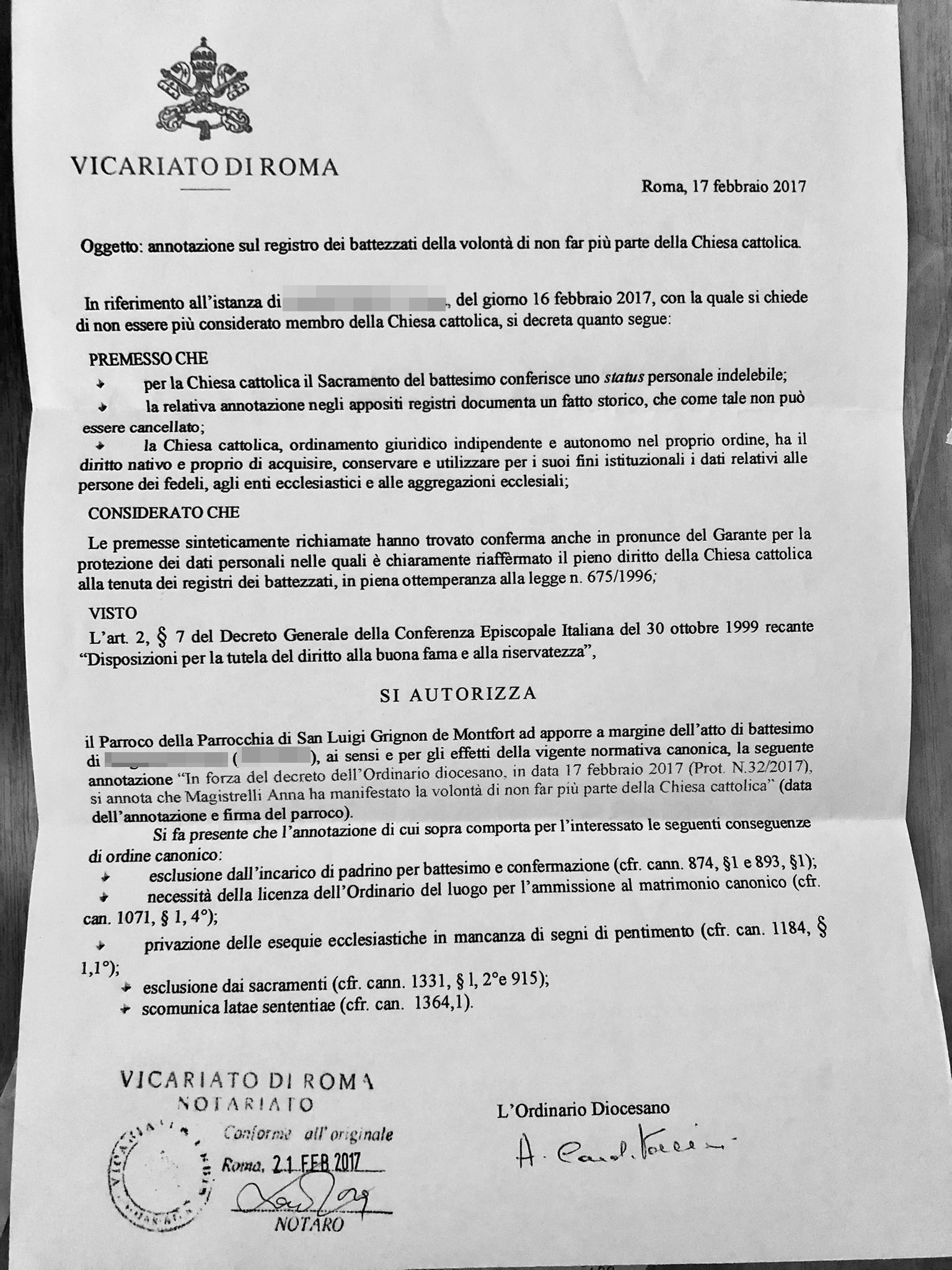 Una persona ha chiesto la rettifica dei dati relativi al proprio battesimo avvenuto a S. Luigi Grignon De Monfort - ROMA (RM) il 17/02/2017, dichiarando di non voler più far parte della Chiesa Cattolica.