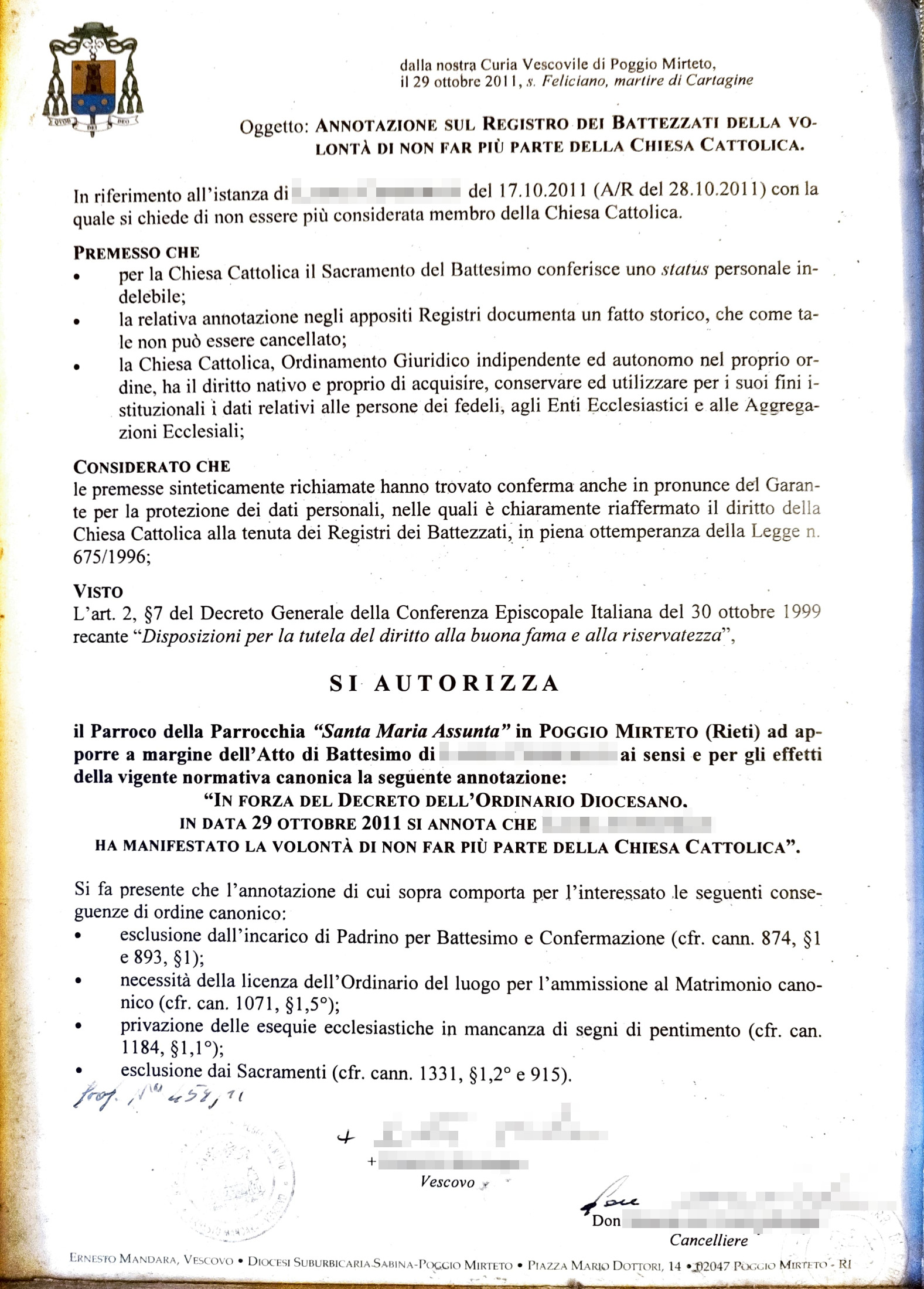 Una persona ha chiesto la rettifica dei dati relativi al proprio battesimo avvenuto a S. Maria Assunta - Cattedrale - POGGIO MIRTETO (RI) il 29/10/2011, dichiarando di non voler più far parte della Chiesa Cattolica.