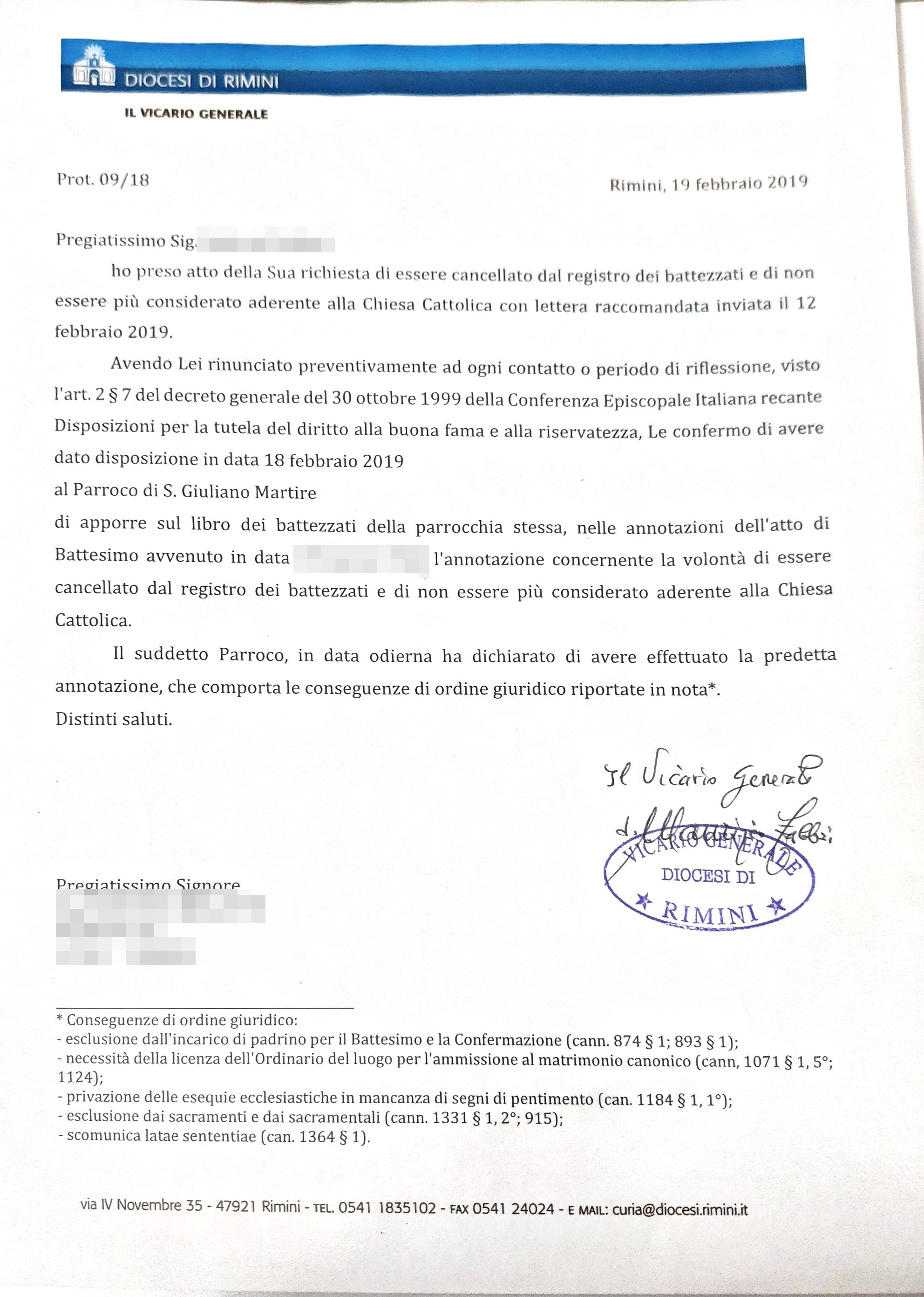 Una persona ha chiesto la rettifica dei dati relativi al proprio battesimo avvenuto a S. Giuliano Martire - RIMINI (RN) il 19/02/2019, dichiarando di non voler più far parte della Chiesa Cattolica.