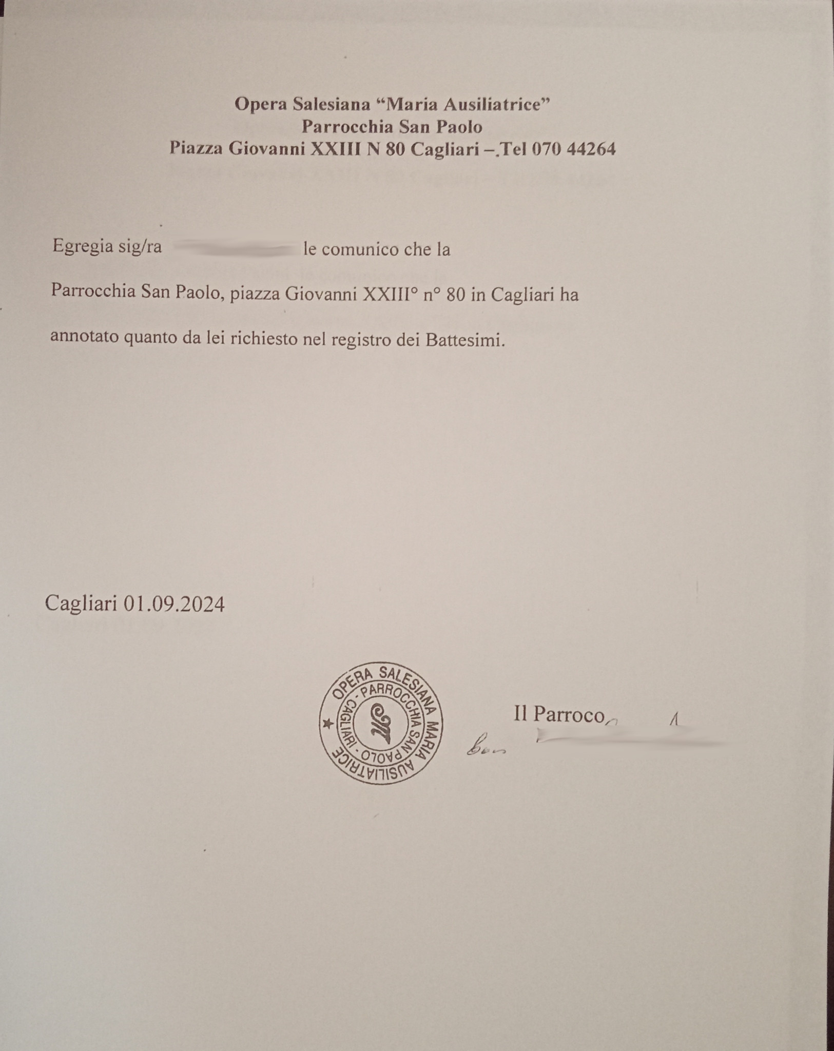 Una persona ha chiesto la rettifica dei dati relativi al proprio battesimo avvenuto a S. Paolo - CAGLIARI (CA) il 03/09/2025, dichiarando di non voler più far parte della Chiesa Cattolica.