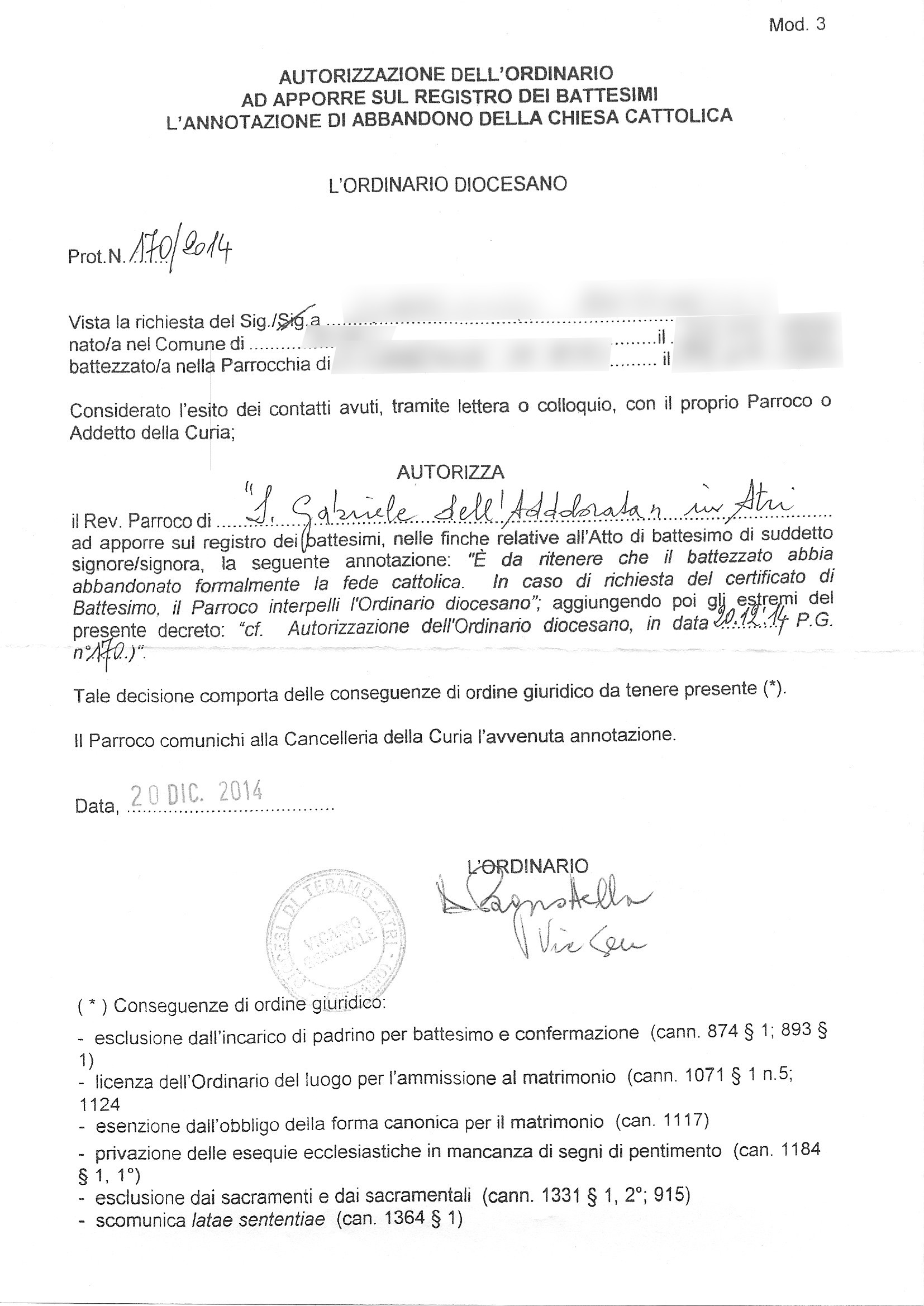 Una persona ha chiesto la rettifica dei dati relativi al proprio battesimo avvenuto a S. Gabriele dell'addolorata - ATRI (TE) il 20/12/2014, dichiarando di non voler più far parte della Chiesa Cattolica.