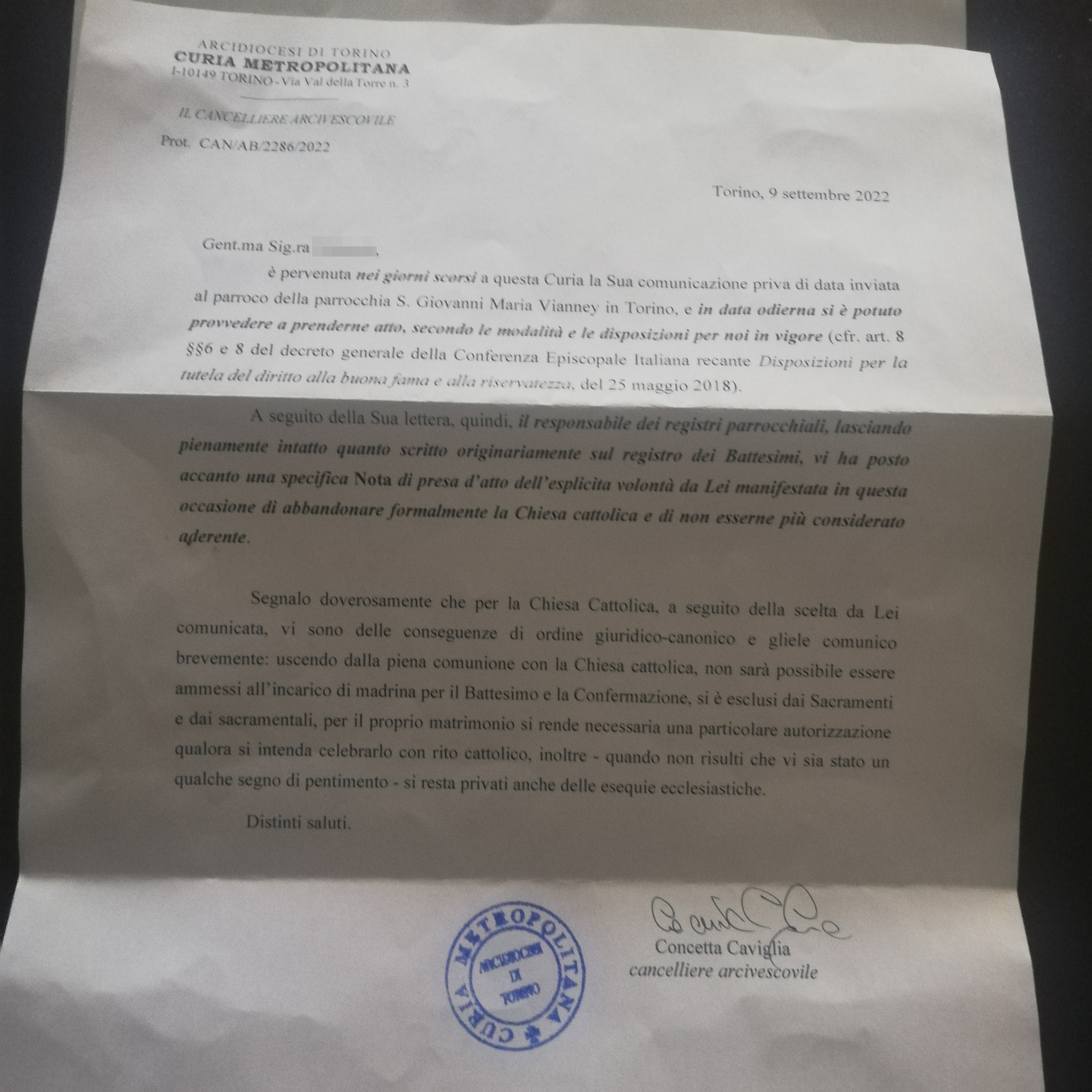 Una persona ha chiesto la rettifica dei dati relativi al proprio battesimo avvenuto a S. Giovanni Maria Vianney - TORINO (TO) il 14/09/2022, dichiarando di non voler più far parte della Chiesa Cattolica.