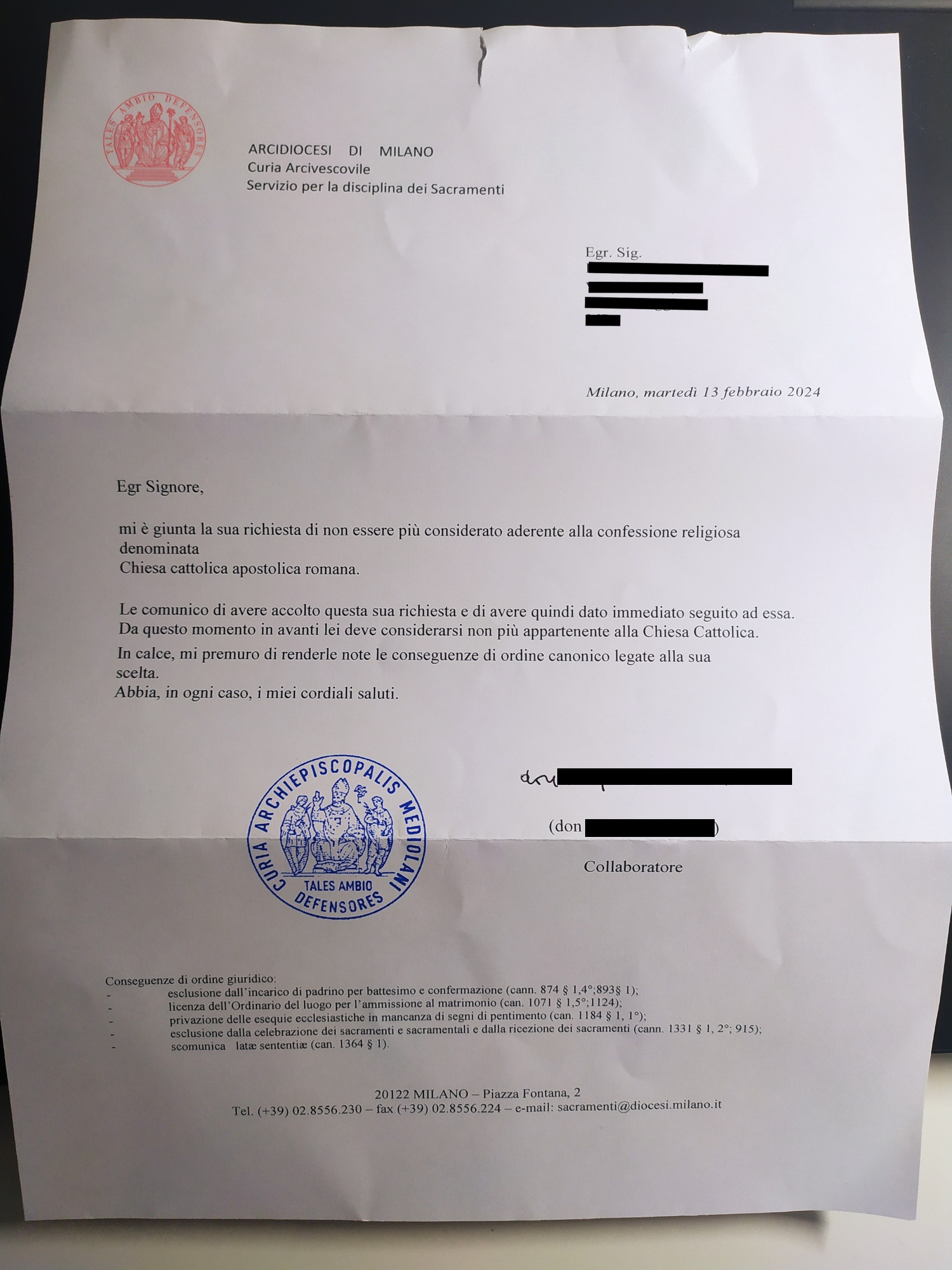 Una persona ha chiesto la rettifica dei dati relativi al proprio battesimo avvenuto a S. Carlo - MONZA (MB) il 13/02/2024, dichiarando di non voler più far parte della Chiesa Cattolica.