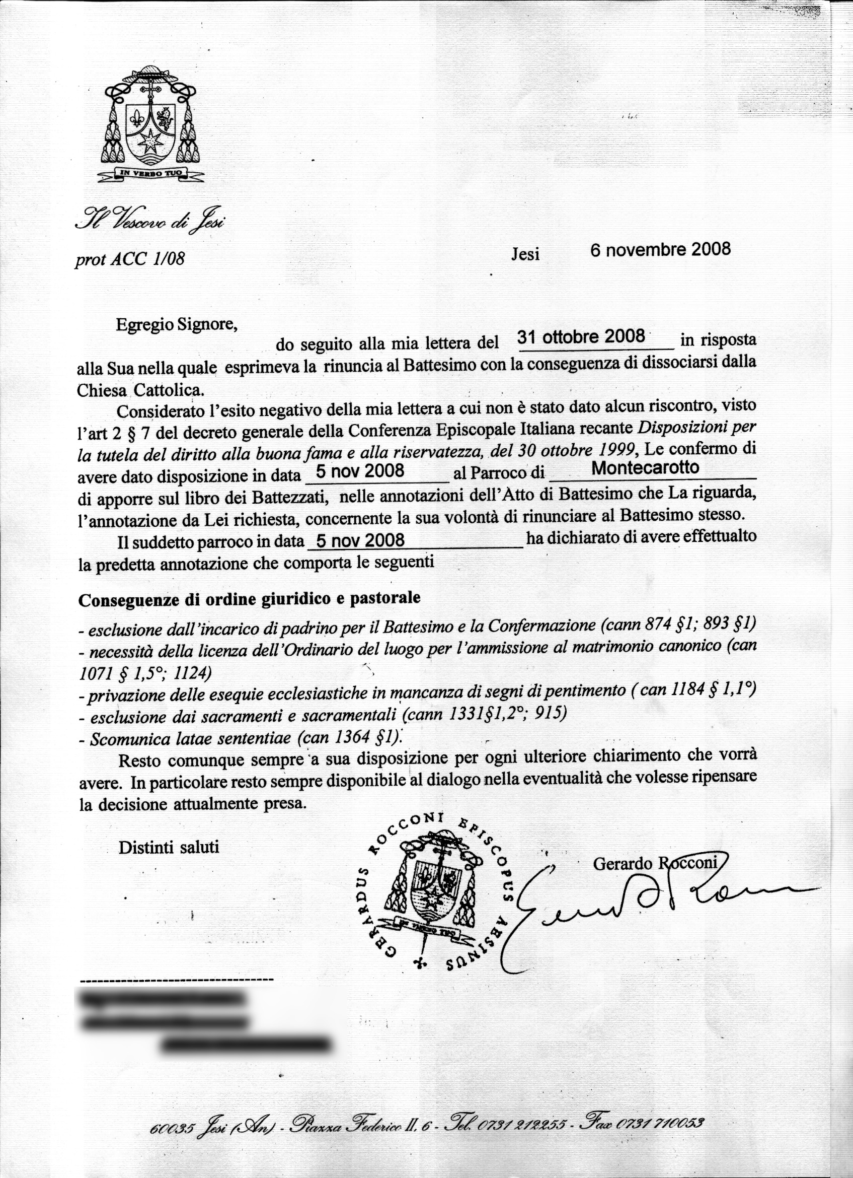 Una persona ha chiesto la rettifica dei dati relativi al proprio battesimo avvenuto a Santissima Annunziata - MONTECAROTTO (AN) il 05/11/2008, dichiarando di non voler più far parte della Chiesa Cattolica.