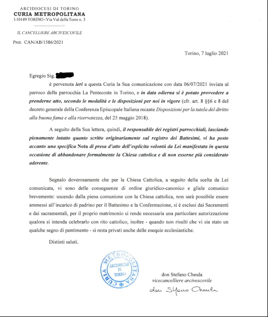 Una persona ha chiesto la rettifica dei dati relativi al proprio battesimo avvenuto a La Pentecoste - TORINO (TO) il 08/07/2021, dichiarando di non voler più far parte della Chiesa Cattolica.