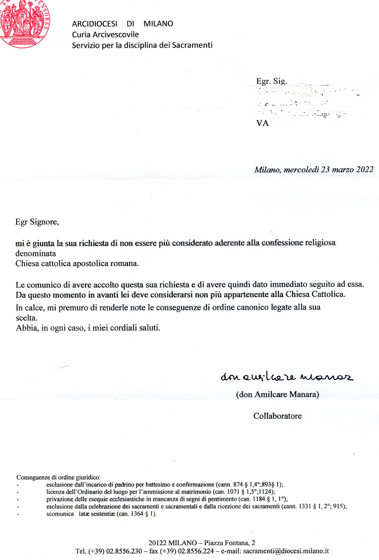 Una persona ha chiesto la rettifica dei dati relativi al proprio battesimo avvenuto a S. Maria Assunta - GALLARATE (VA) il 23/02/2022, dichiarando di non voler più far parte della Chiesa Cattolica.