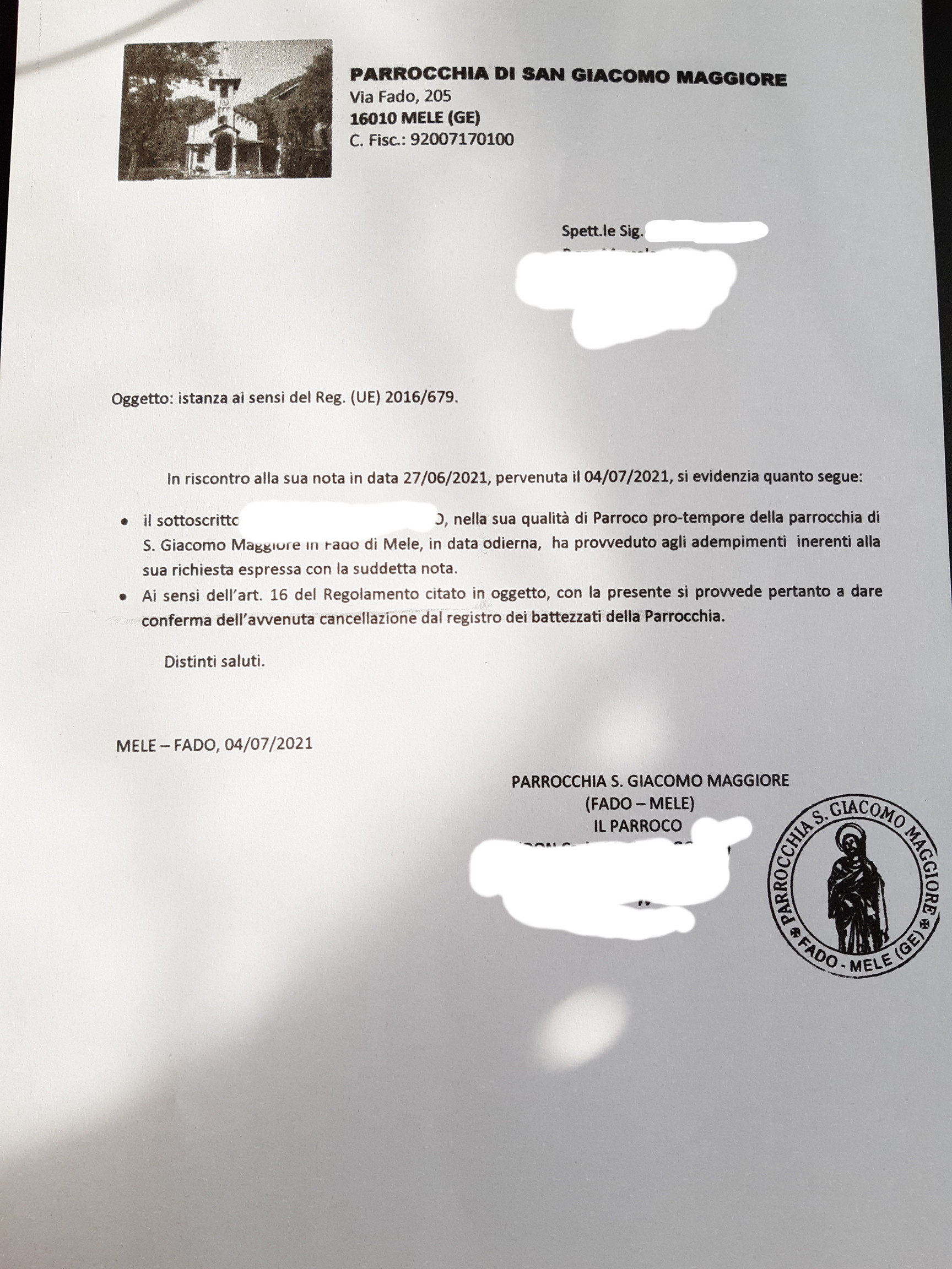 Una persona ha chiesto la rettifica dei dati relativi al proprio battesimo avvenuto a S. Giacomo Maggiore - MELE (GE) il 04/07/2021, dichiarando di non voler più far parte della Chiesa Cattolica.