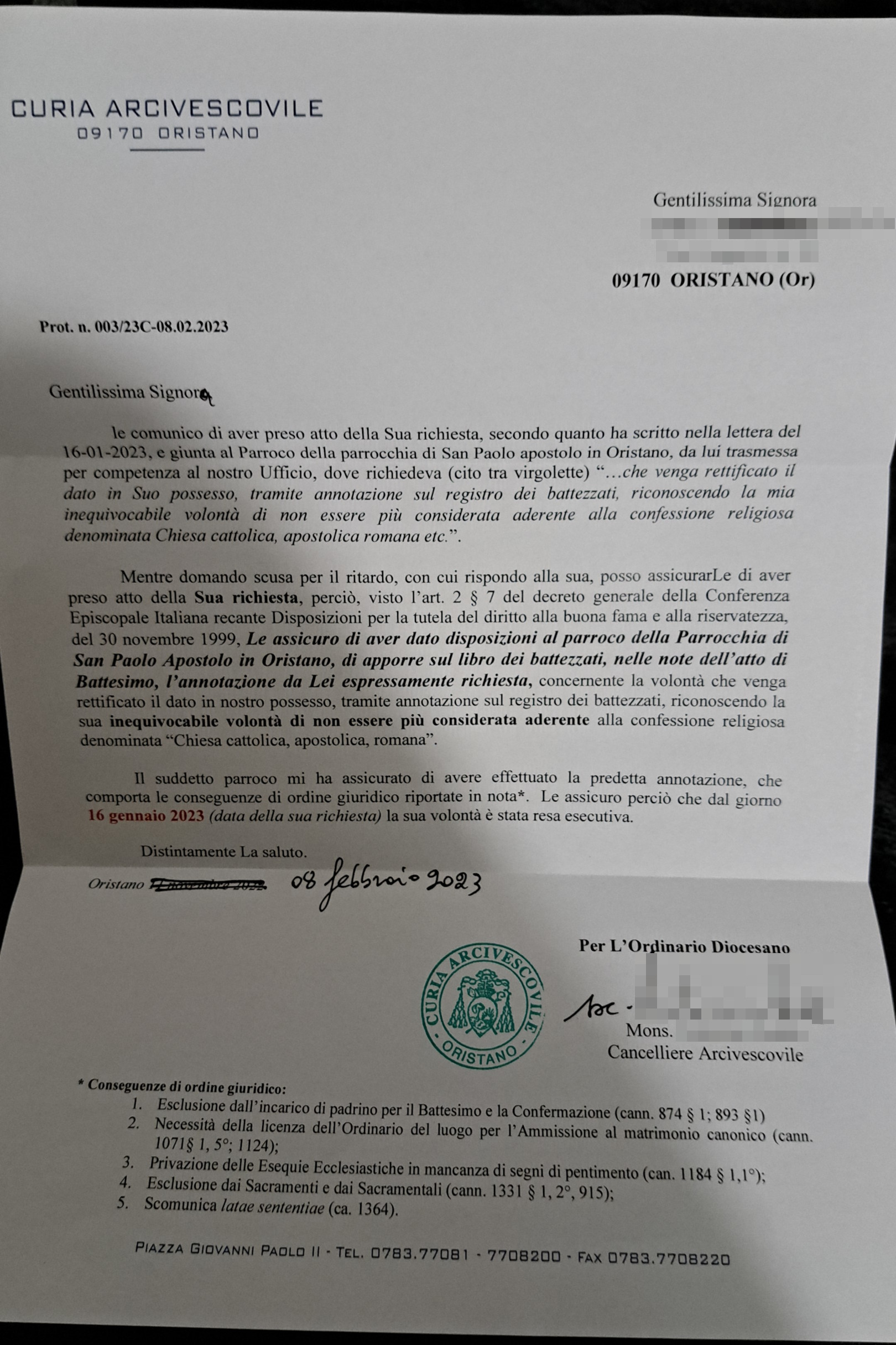 Una persona ha chiesto la rettifica dei dati relativi al proprio battesimo avvenuto a S. Paolo Apostolo - ORISTANO (OR) il 08/02/2023, dichiarando di non voler più far parte della Chiesa Cattolica.