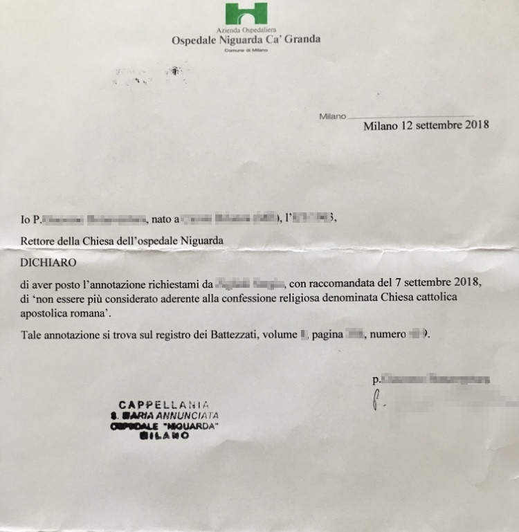 Una persona ha chiesto la rettifica dei dati relativi al proprio battesimo avvenuto a Santa Maria Annunciata - MILANO (MI) il 02/09/2018, dichiarando di non voler più far parte della Chiesa Cattolica.