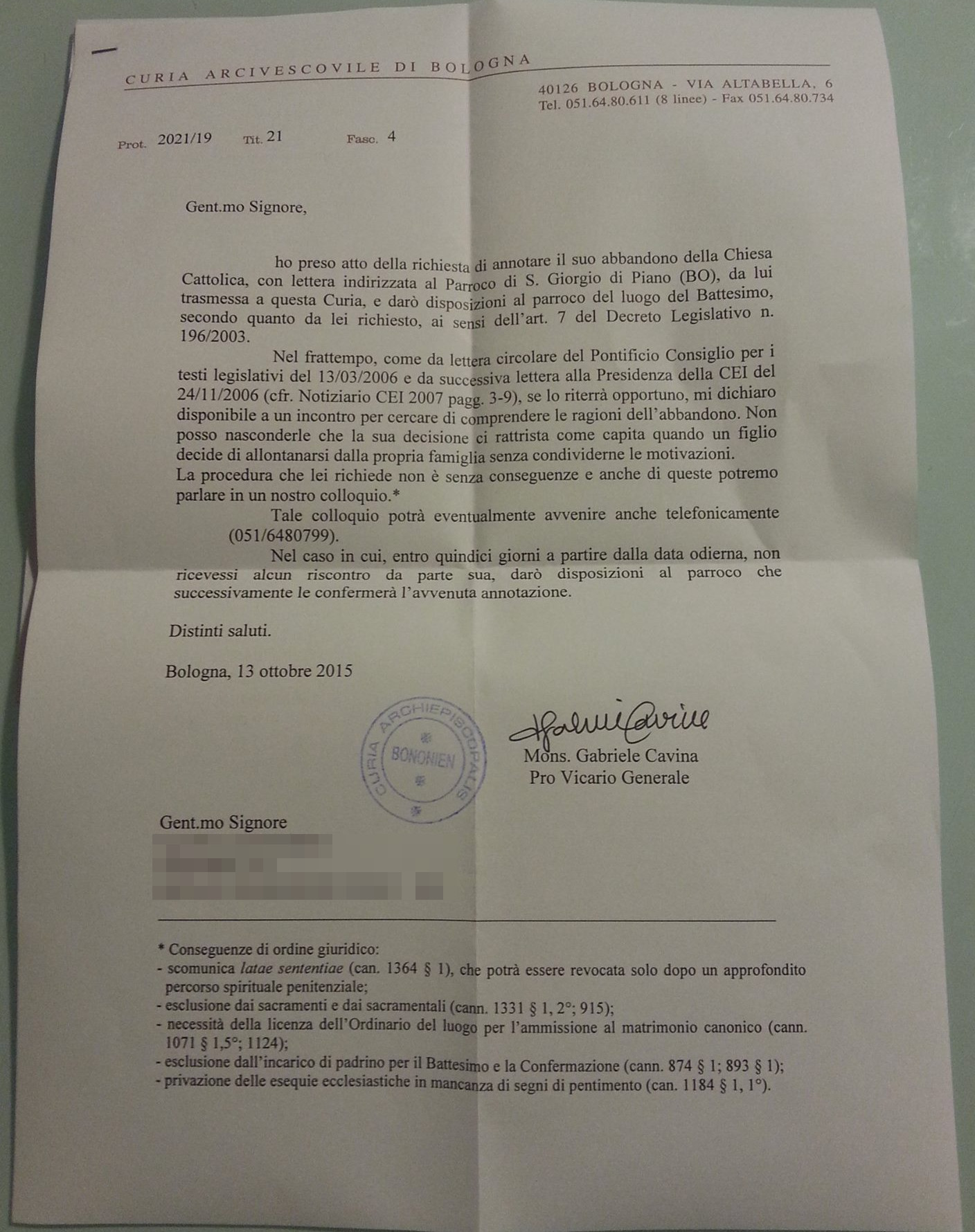 Una persona ha chiesto la rettifica dei dati relativi al proprio battesimo avvenuto a S. Giorgio di Piano - SAN GIORGIO DI PIANO (BO) il 13/10/2015, dichiarando di non voler più far parte della Chiesa Cattolica.