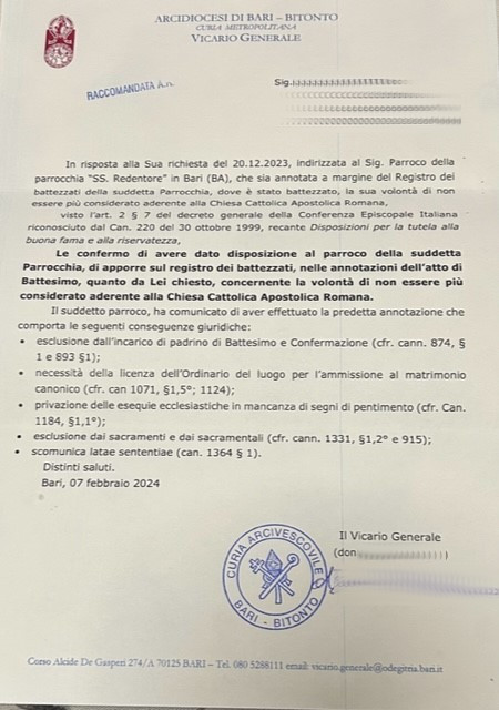 Una persona ha chiesto la rettifica dei dati relativi al proprio battesimo avvenuto a Ss. Redentore - BARI (BA) il 07/01/2024, dichiarando di non voler più far parte della Chiesa Cattolica.