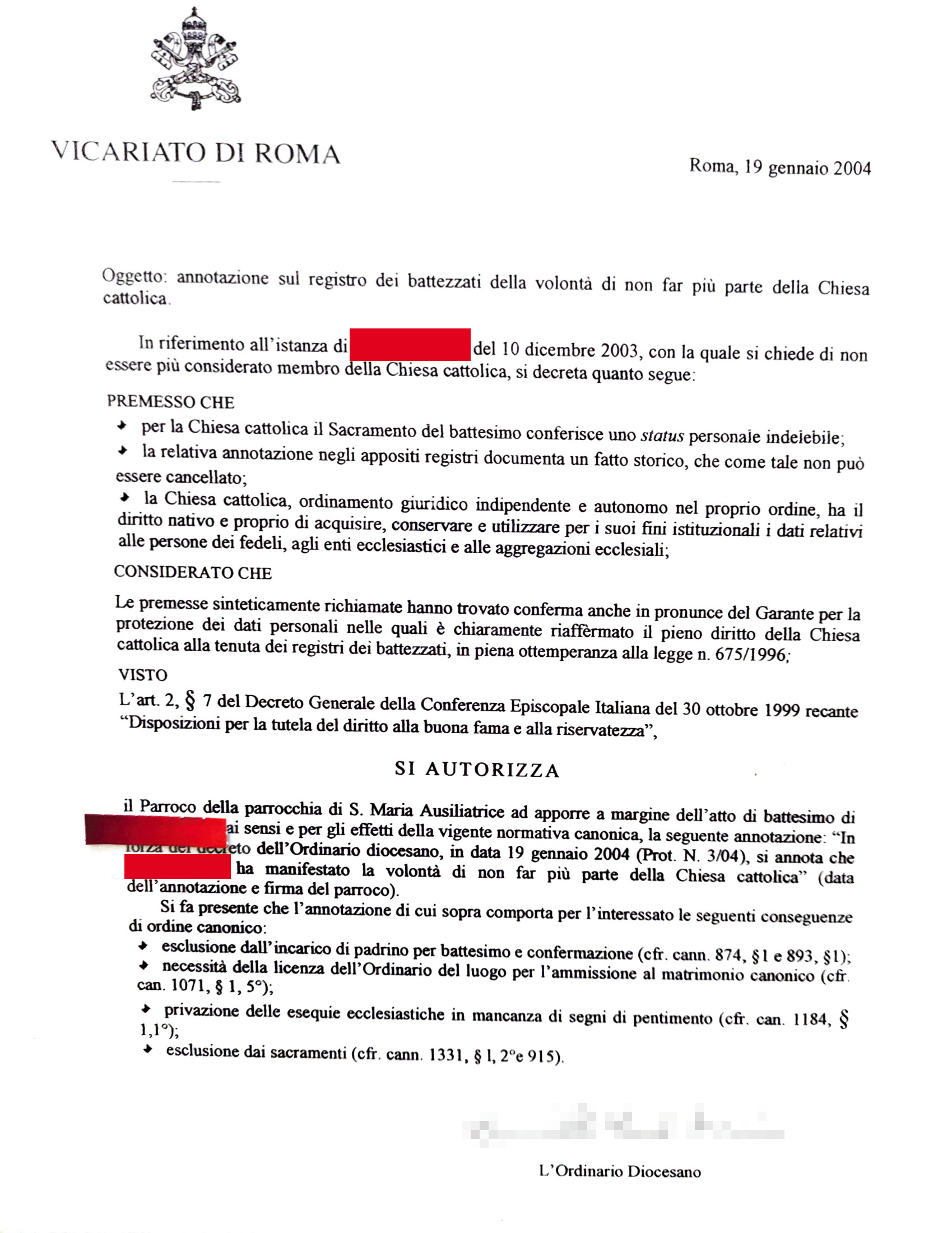 Firmato dal Cardinal Ruini in persona che aveva prima tentato di convocarmi in Vicariato per parlarmi e informarmi di cosa stavo per fare...ahaha