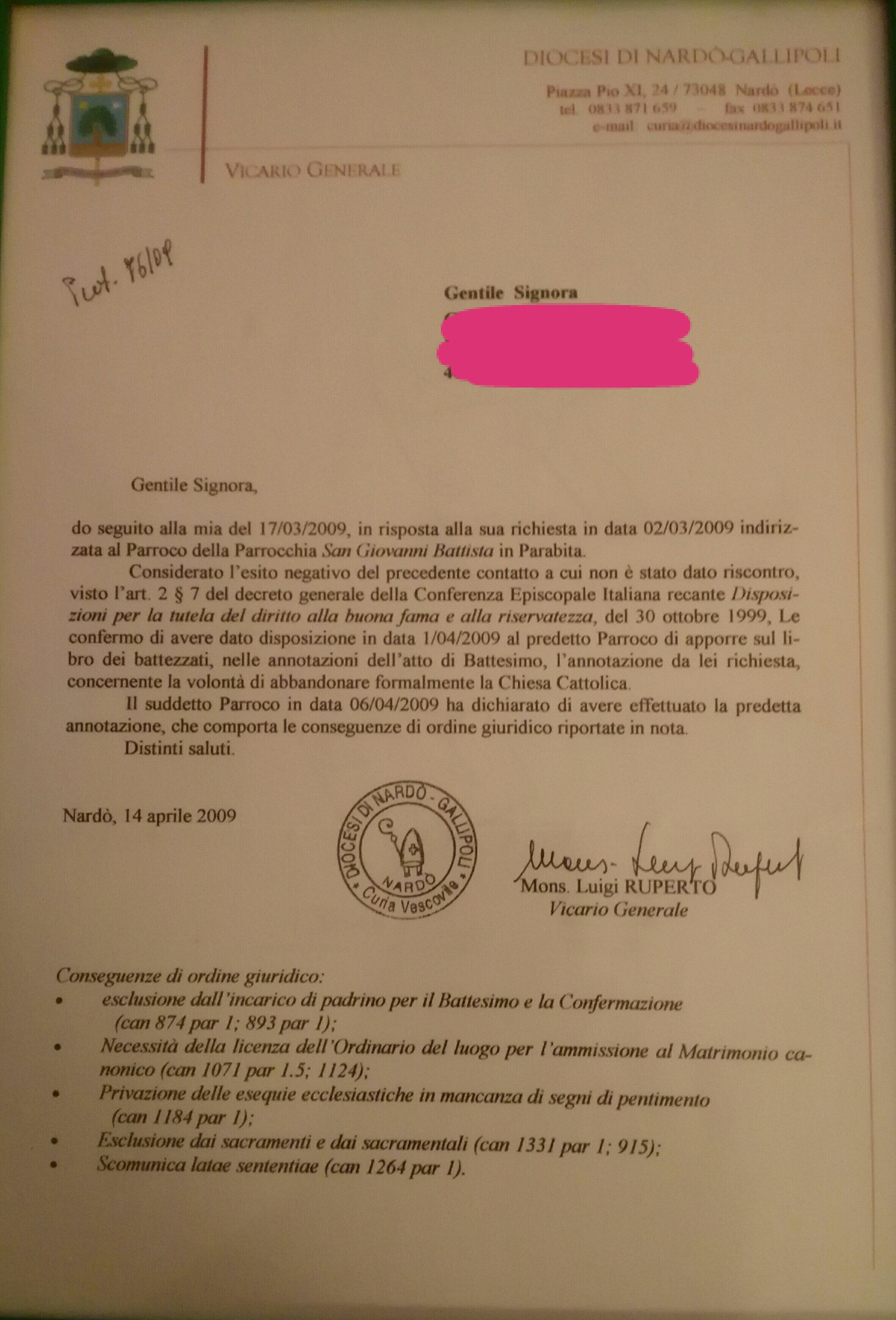 Una persona ha chiesto la rettifica dei dati relativi al proprio battesimo avvenuto a S. Giovanni Battista - PARABITA (LE) il 14/04/2009, dichiarando di non voler più far parte della Chiesa Cattolica.