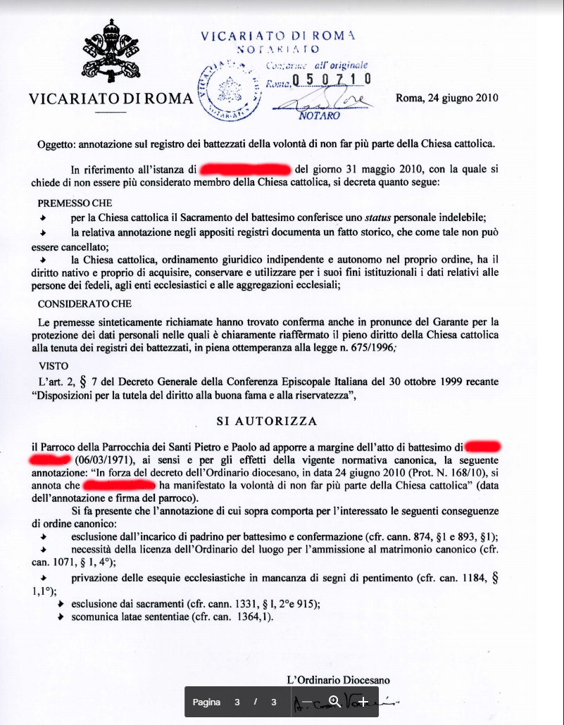 Una persona ha chiesto la rettifica dei dati relativi al proprio battesimo avvenuto a Santi Pietro e Paolo - ROMA (RM) il 24/06/2010, dichiarando di non voler più far parte della Chiesa Cattolica.