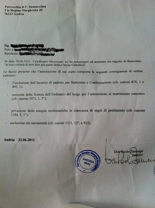 Una persona ha chiesto la rettifica dei dati relativi al proprio battesimo avvenuto a Beata Vergine Immacolata - ANDRIA (BT) il 18/06/2011, dichiarando di non voler più far parte della Chiesa Cattolica.