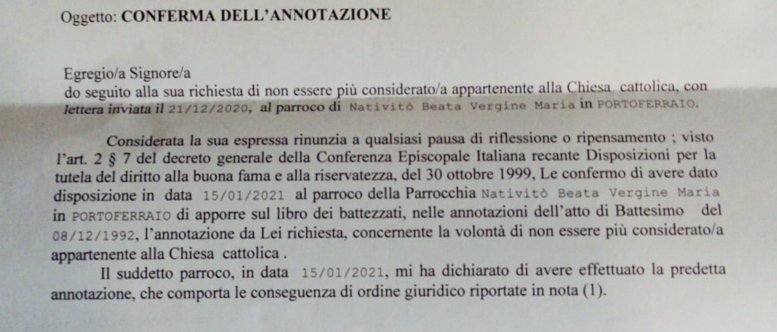 Una persona ha chiesto la rettifica dei dati relativi al proprio battesimo avvenuto a Natività Beata Vergine Maria - PORTOFERRAIO (LI) il 15/01/2021, dichiarando di non voler più far parte della Chiesa Cattolica.