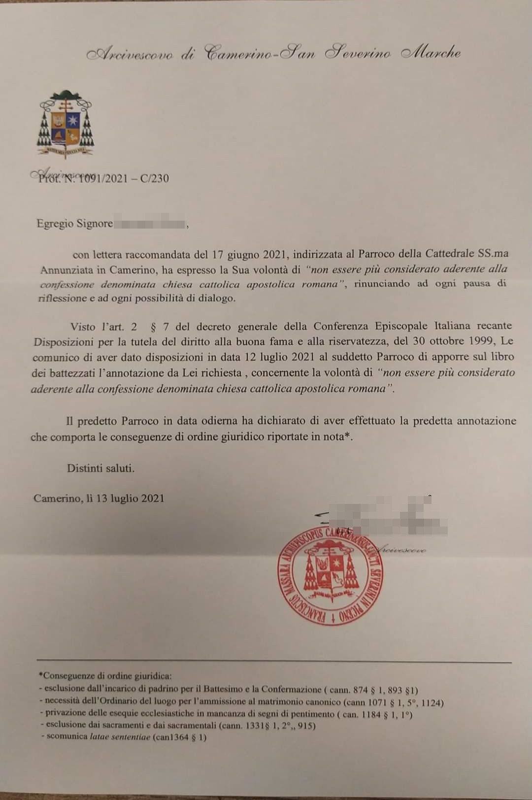 Una persona ha chiesto la rettifica dei dati relativi al proprio battesimo avvenuto a Ss. Annunziata - Cattedrale - CAMERINO (MC) il 13/07/2021, dichiarando di non voler più far parte della Chiesa Cattolica.
