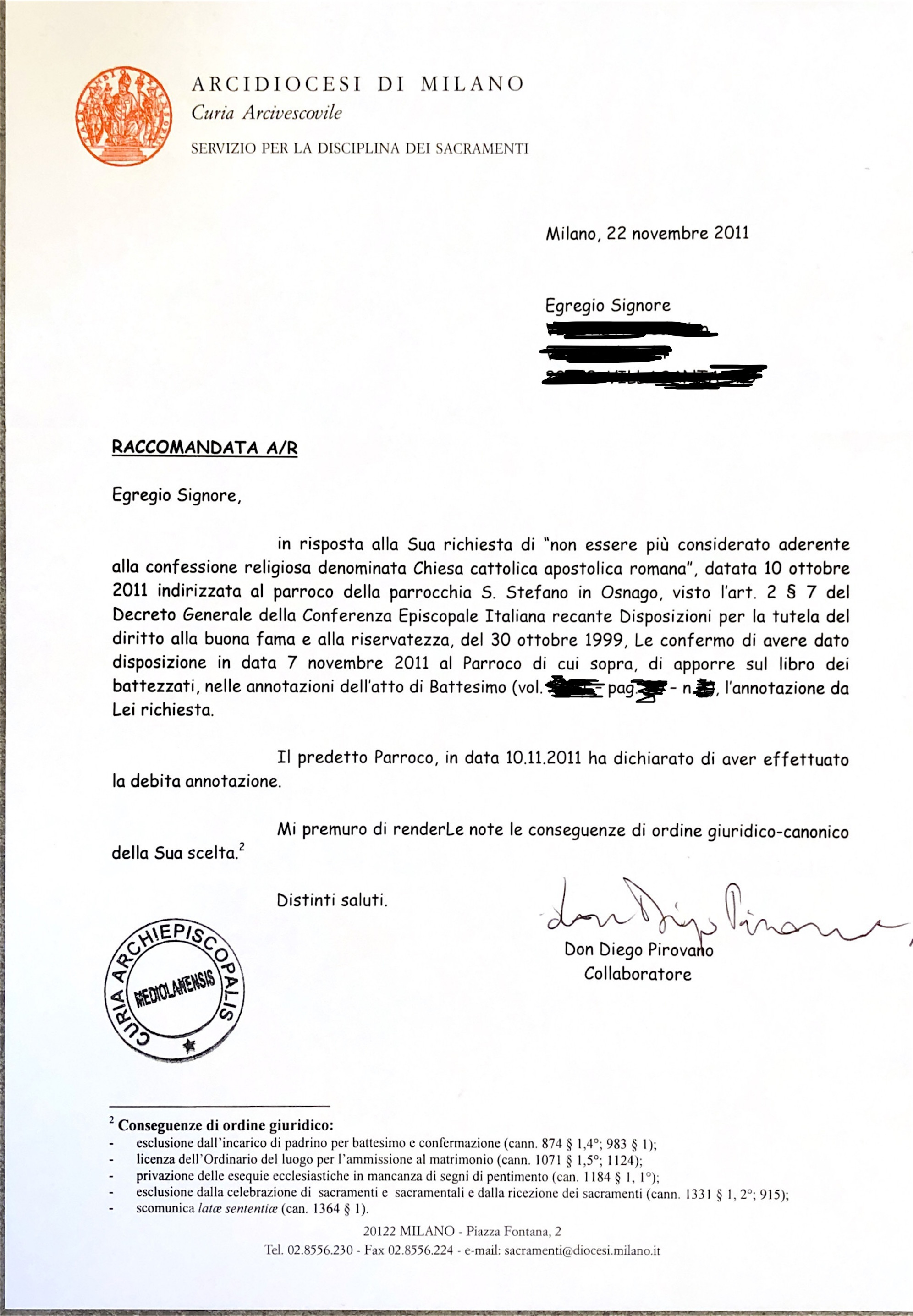 Una persona ha chiesto la rettifica dei dati relativi al proprio battesimo avvenuto a S. Stefano - OSNAGO (LC) il 10/11/2011, dichiarando di non voler più far parte della Chiesa Cattolica.