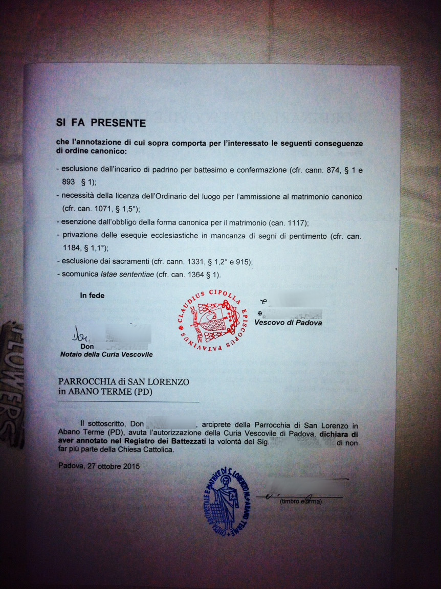 Una persona ha chiesto la rettifica dei dati relativi al proprio battesimo avvenuto a S. Lorenzo Martire - ABANO TERME (PD) il 27/10/2015, dichiarando di non voler più far parte della Chiesa Cattolica.
