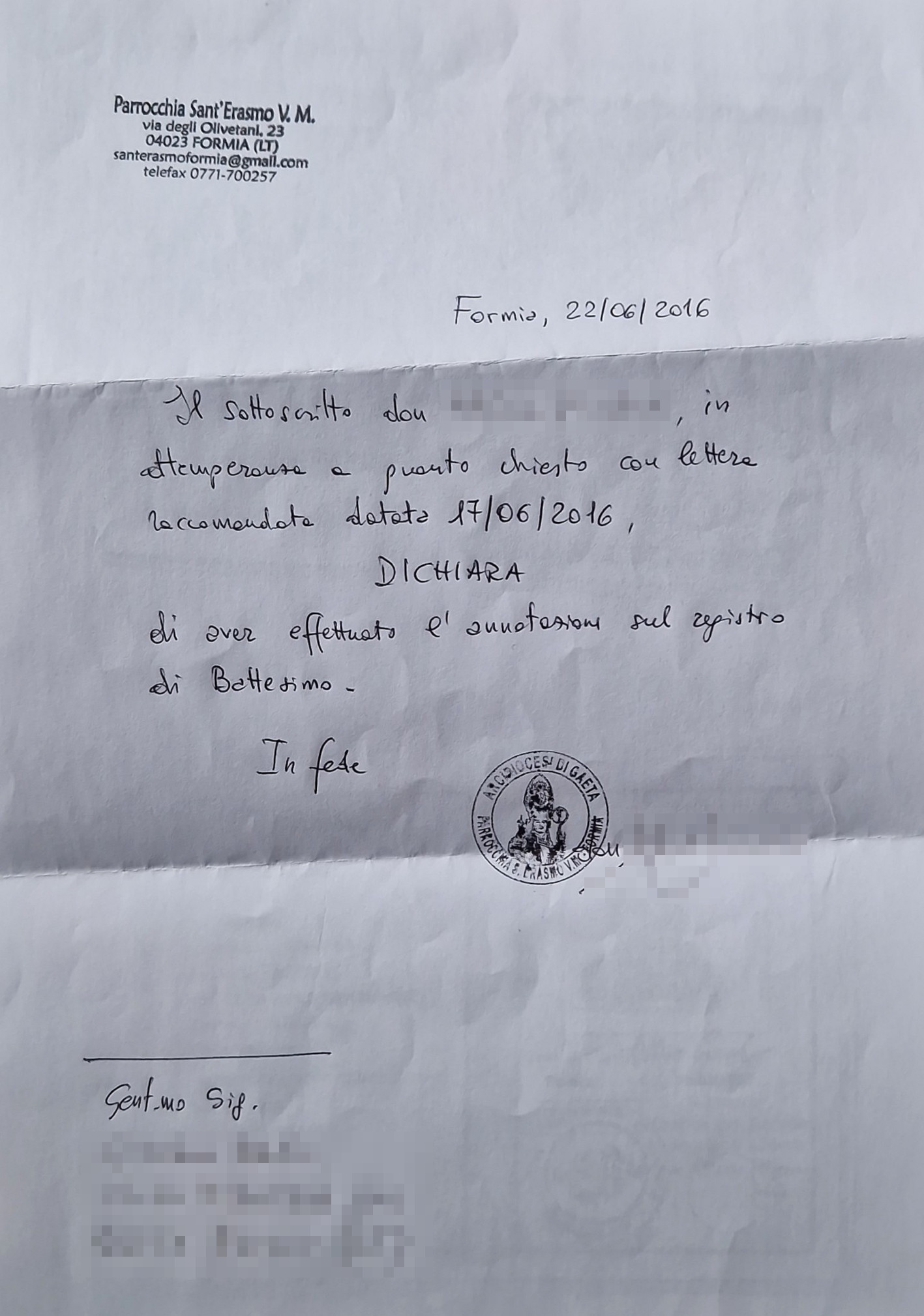 Una persona ha chiesto la rettifica dei dati relativi al proprio battesimo avvenuto a S. Erasmo V. M. - FORMIA (LT) il 22/06/2016, dichiarando di non voler più far parte della Chiesa Cattolica.