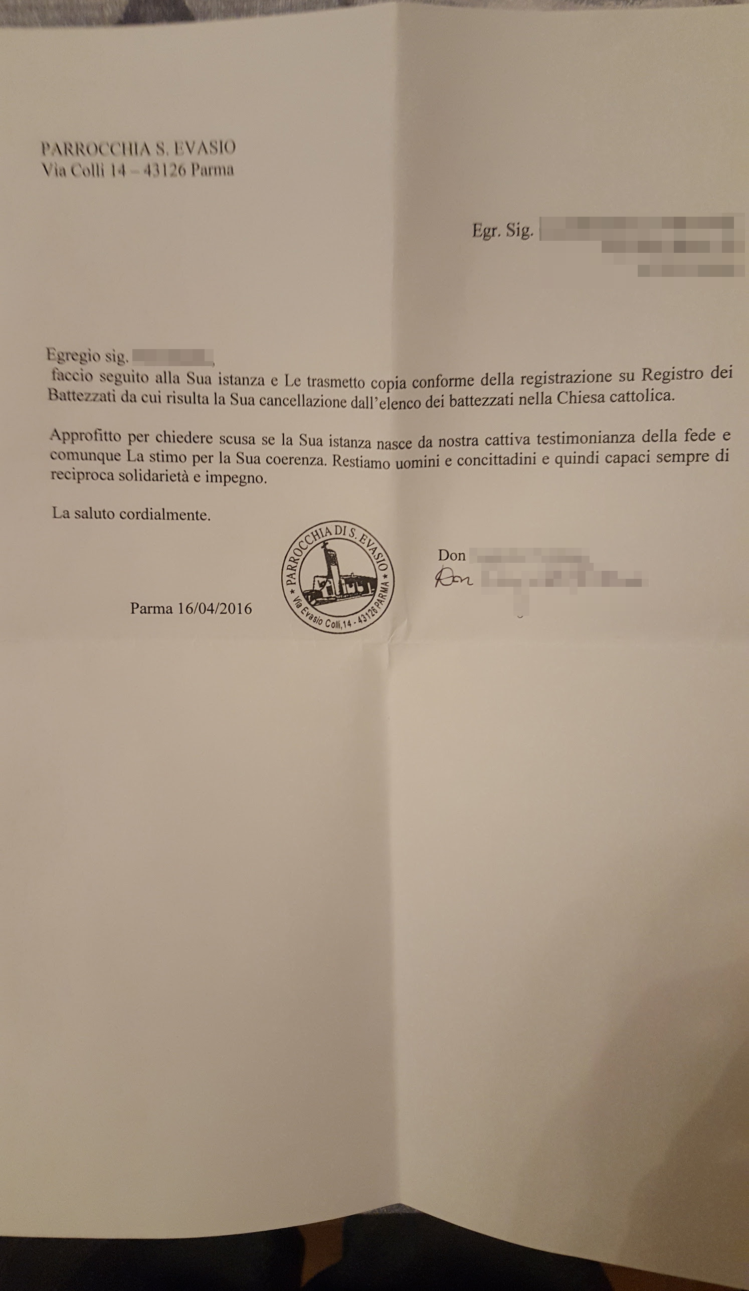 Una persona ha chiesto la rettifica dei dati relativi al proprio battesimo avvenuto a S. Evasio - PARMA (PR) il 16/04/2016, dichiarando di non voler più far parte della Chiesa Cattolica.
