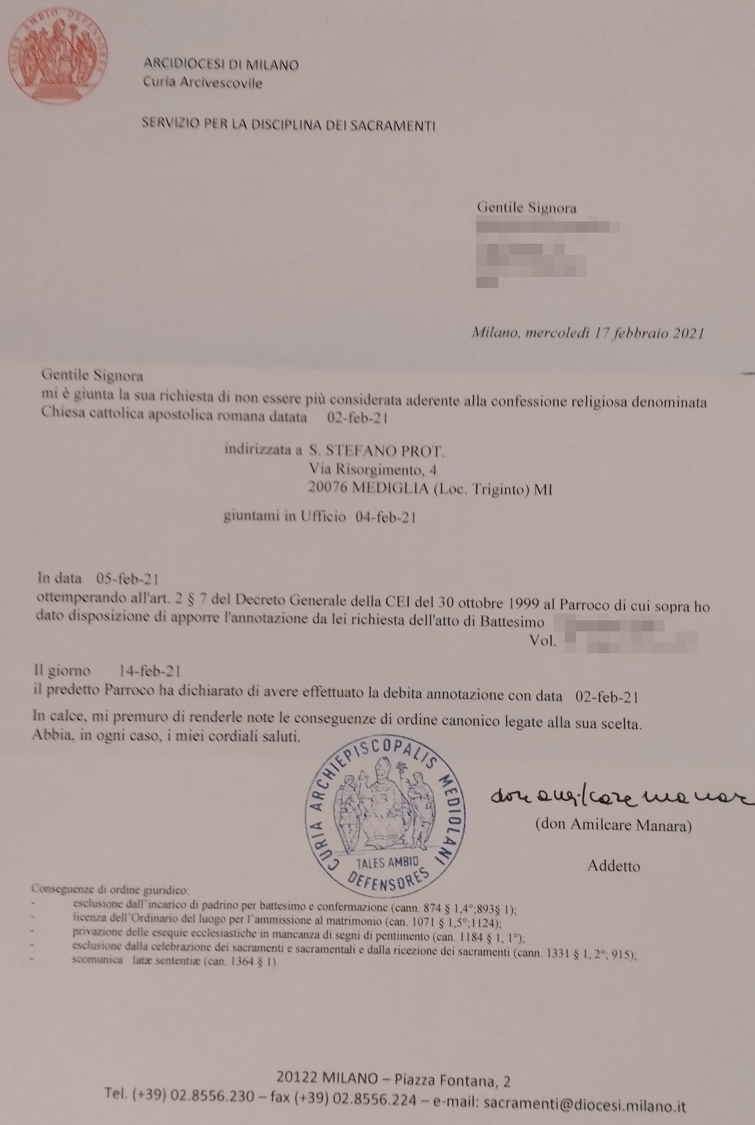 Una persona ha chiesto la rettifica dei dati relativi al proprio battesimo avvenuto a S. Stefano Protomartire - MEDIGLIA (MI) il 14/02/2021, dichiarando di non voler più far parte della Chiesa Cattolica.