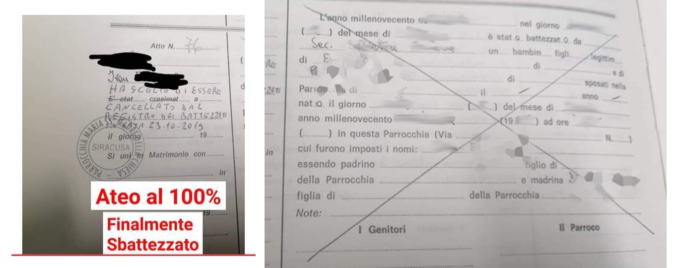 Una persona ha chiesto la rettifica dei dati relativi al proprio battesimo avvenuto a Maria Madre della Chiesa - SIRACUSA (SR) il 23/10/2019, dichiarando di non voler più far parte della Chiesa Cattolica.