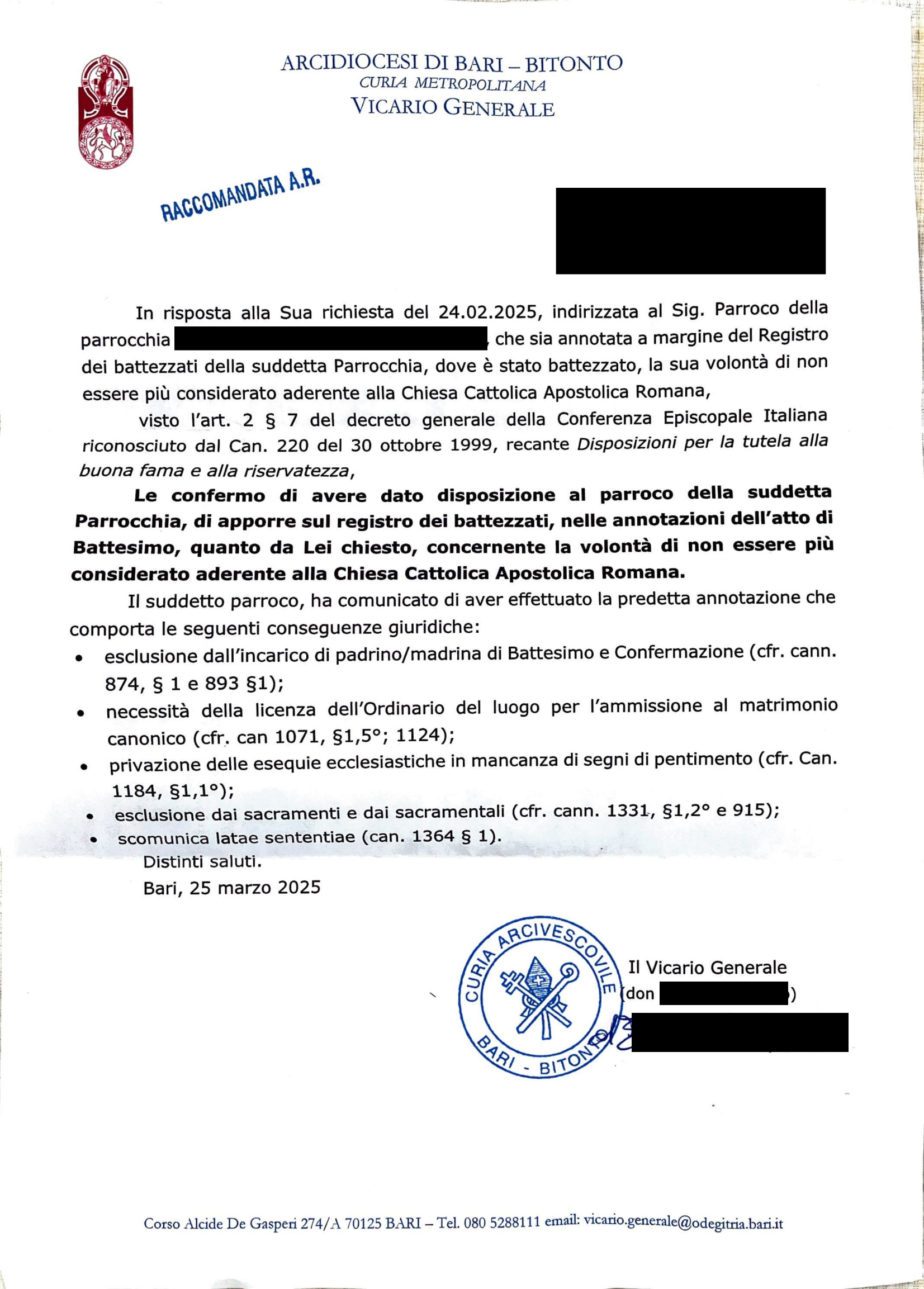 Una persona ha chiesto la rettifica dei dati relativi al proprio battesimo avvenuto a Immacolata - GIOIA DEL COLLE (BA) il 04/04/2025, dichiarando di non voler più far parte della Chiesa Cattolica.