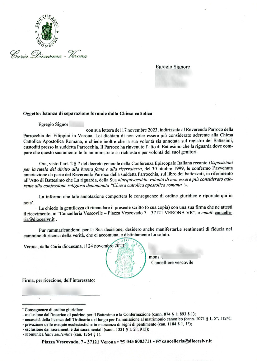 Una persona ha chiesto la rettifica dei dati relativi al proprio battesimo avvenuto a S. Fermo Minore di Brà - VERONA (VR) il 01/12/2023, dichiarando di non voler più far parte della Chiesa Cattolica.