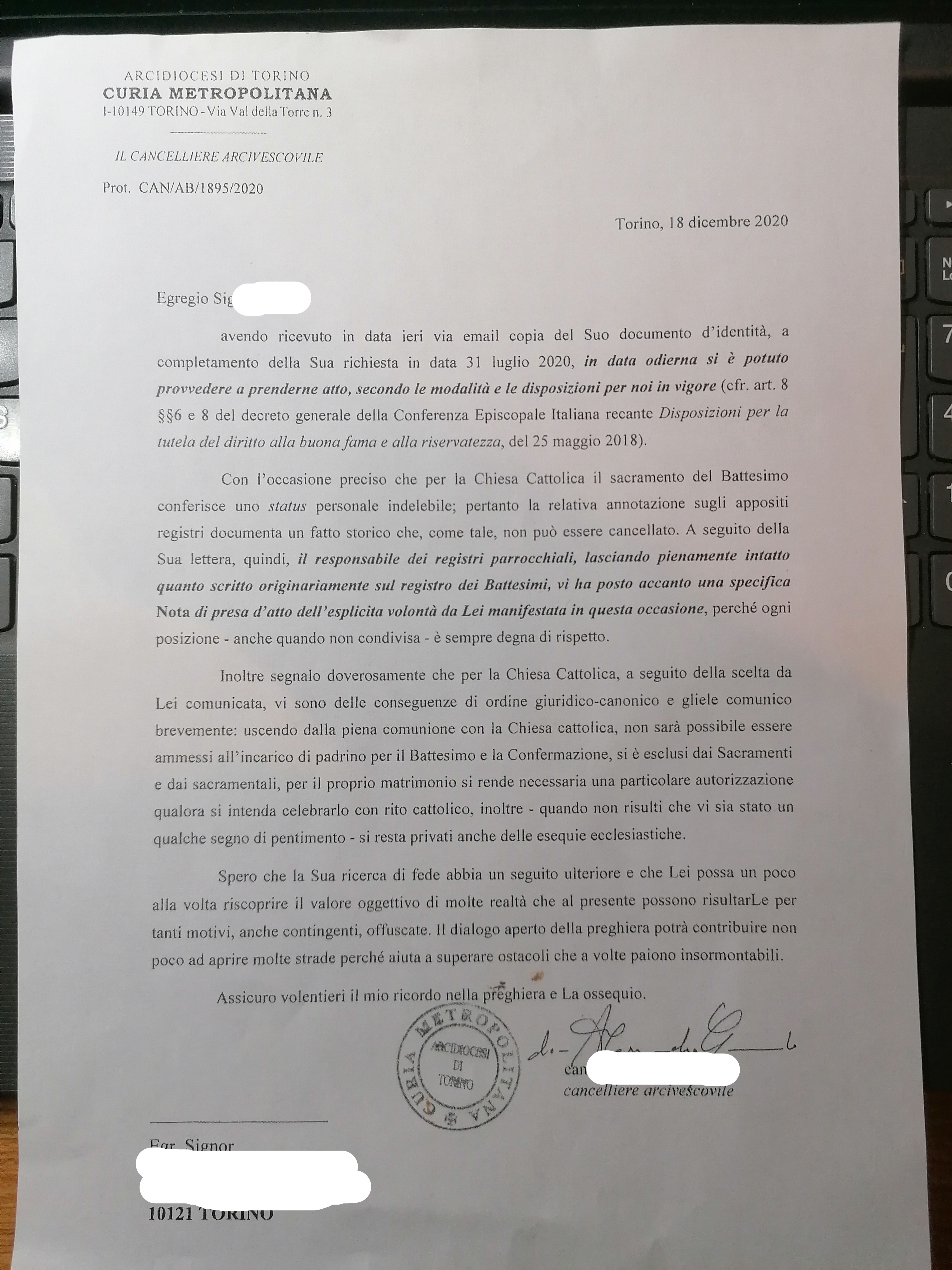 Una persona ha chiesto la rettifica dei dati relativi al proprio battesimo avvenuto a Gesù Buon Pastore - TORINO (TO) il 18/12/2020, dichiarando di non voler più far parte della Chiesa Cattolica.